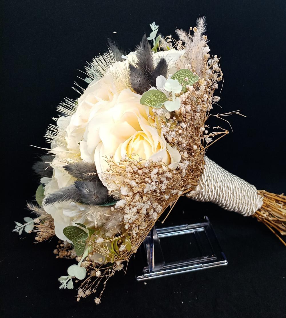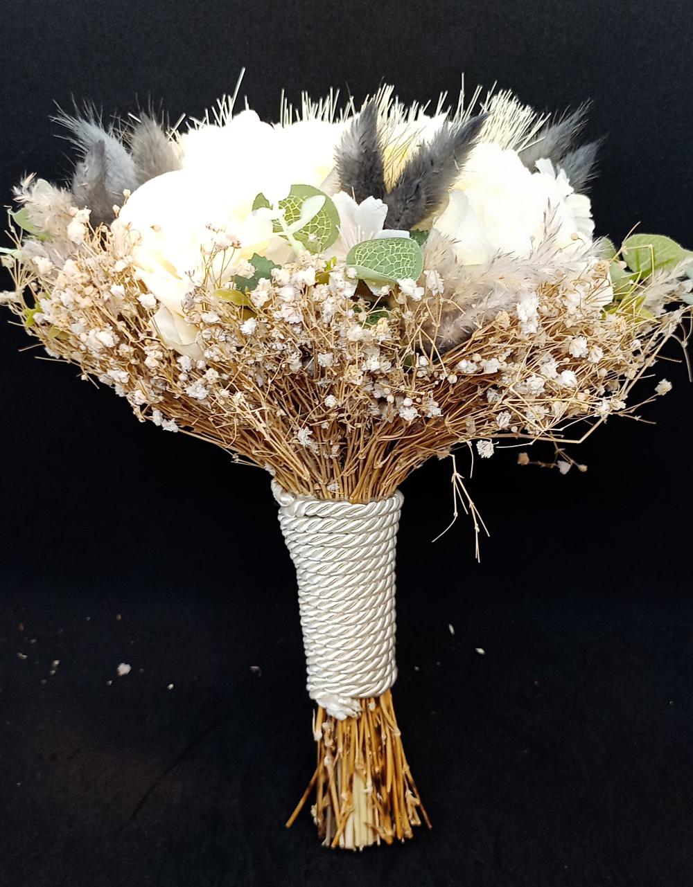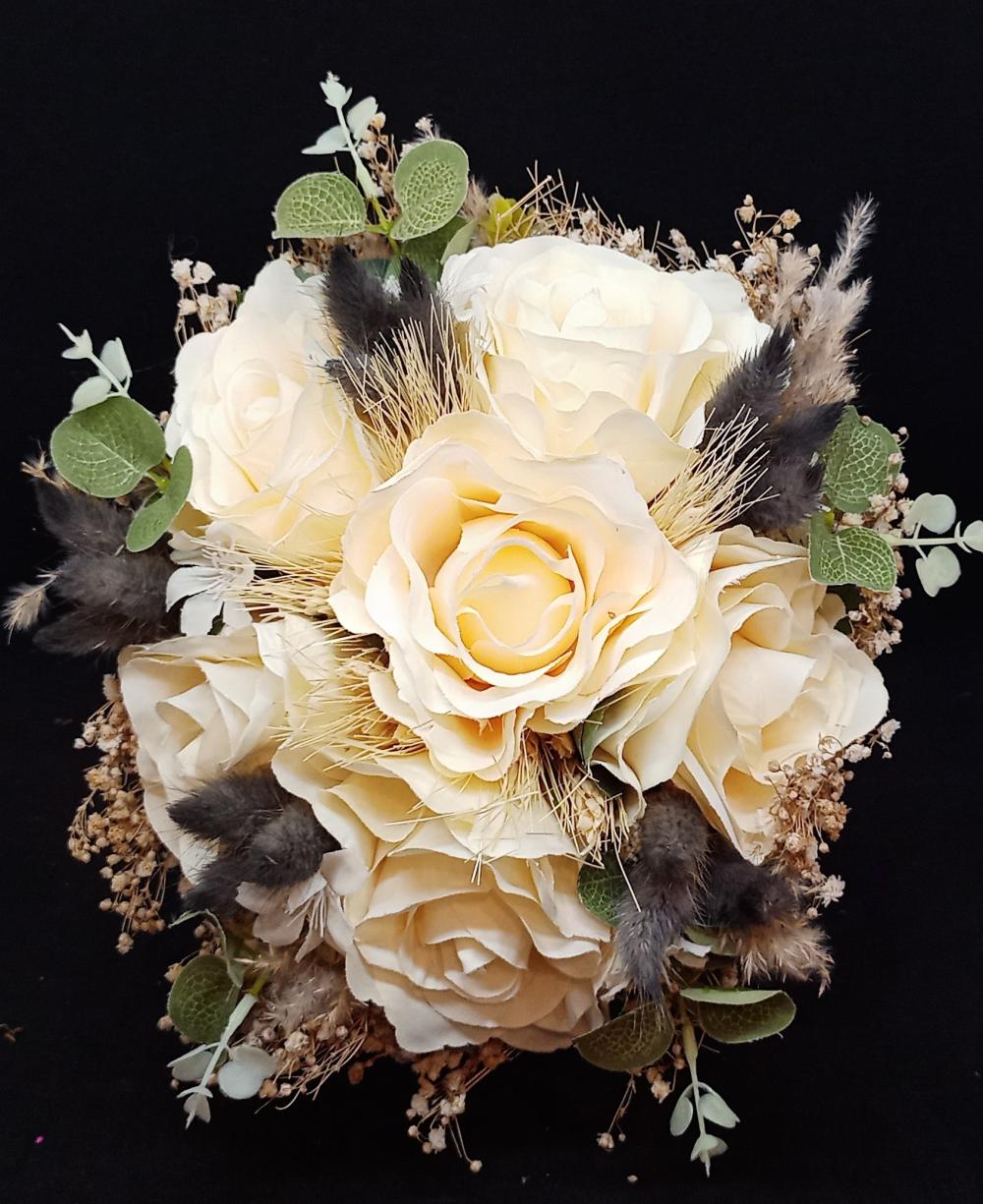 Siyah tavşan kuyruğu otlarıyla süslenmiş sarı güllerden oluşan yapay gelin buketi.
