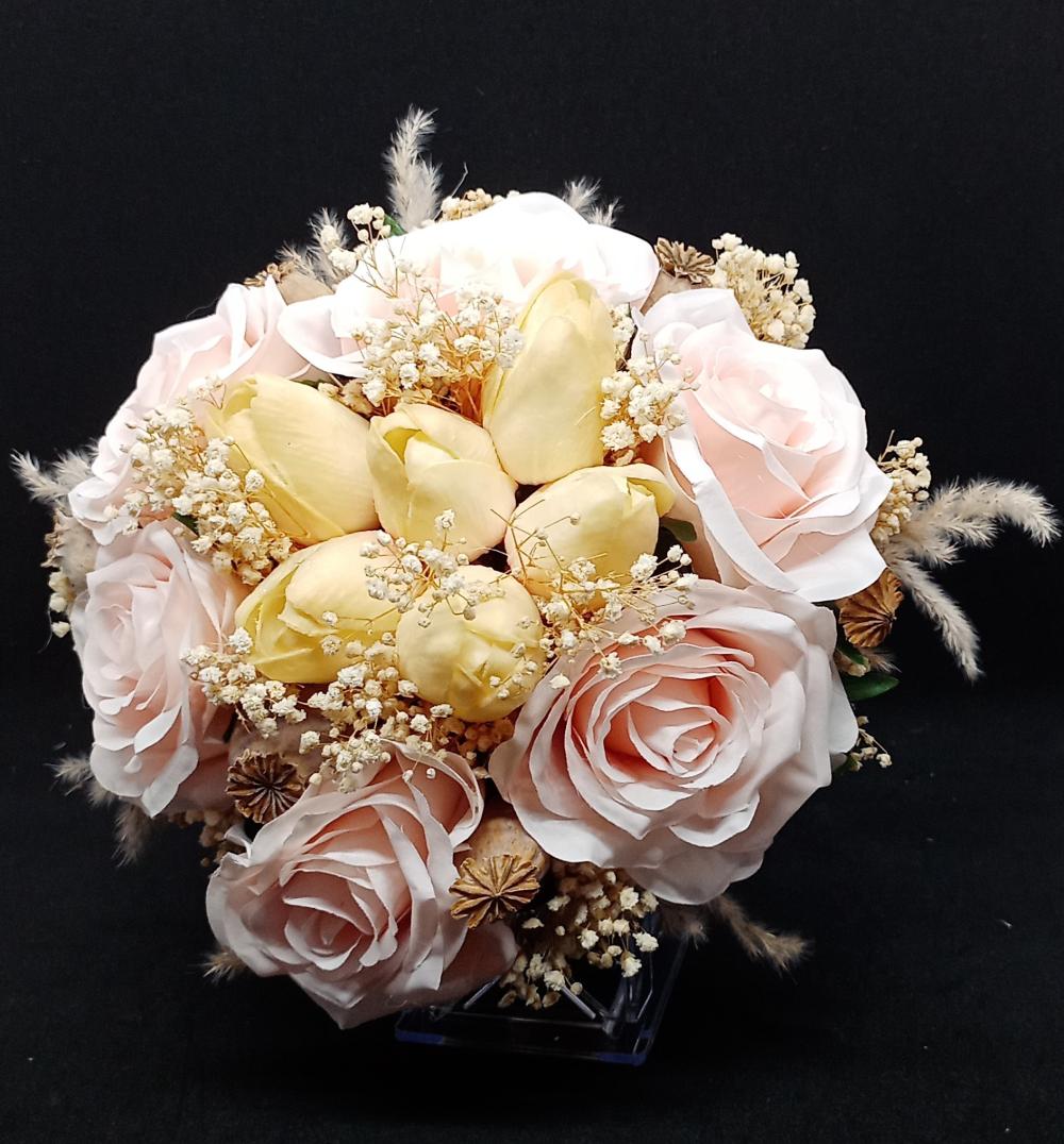 Sarı Laleler Ve Pembe Güllerden Oluşan Gelin Buketi