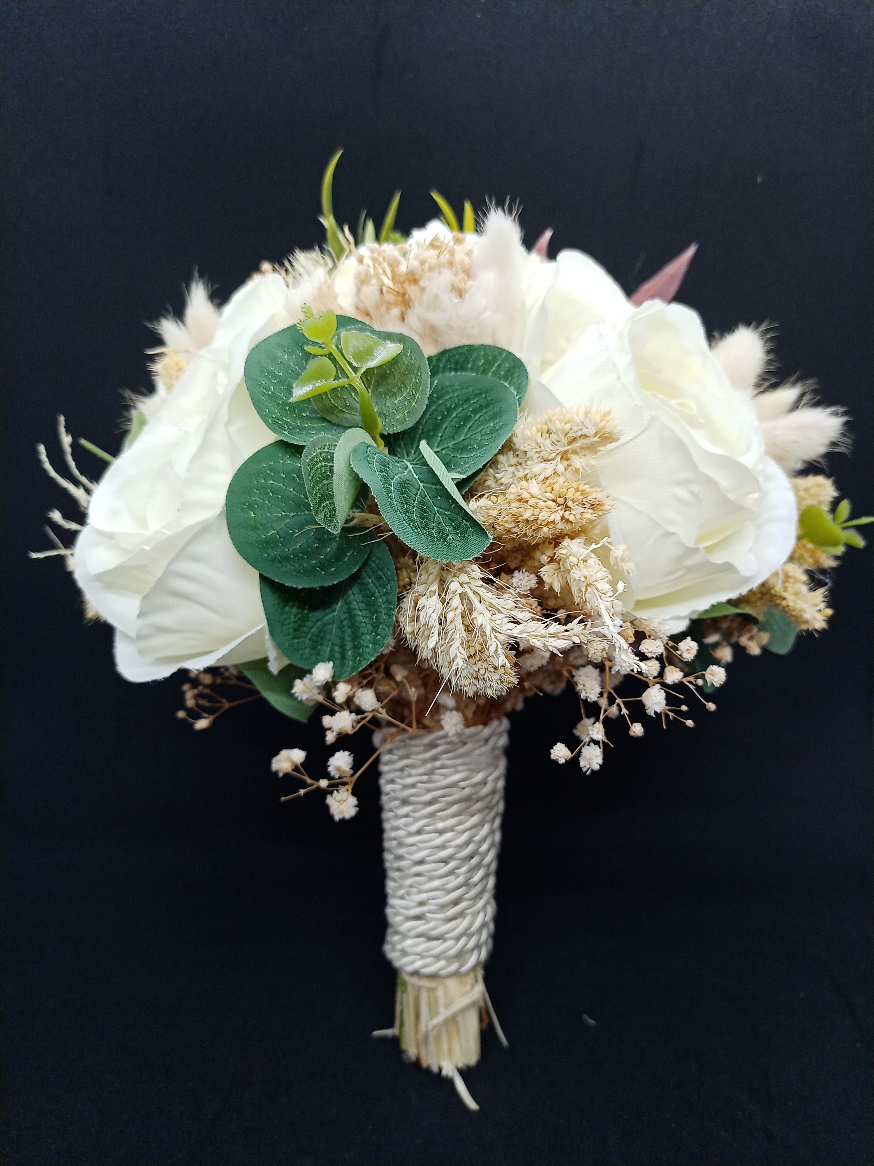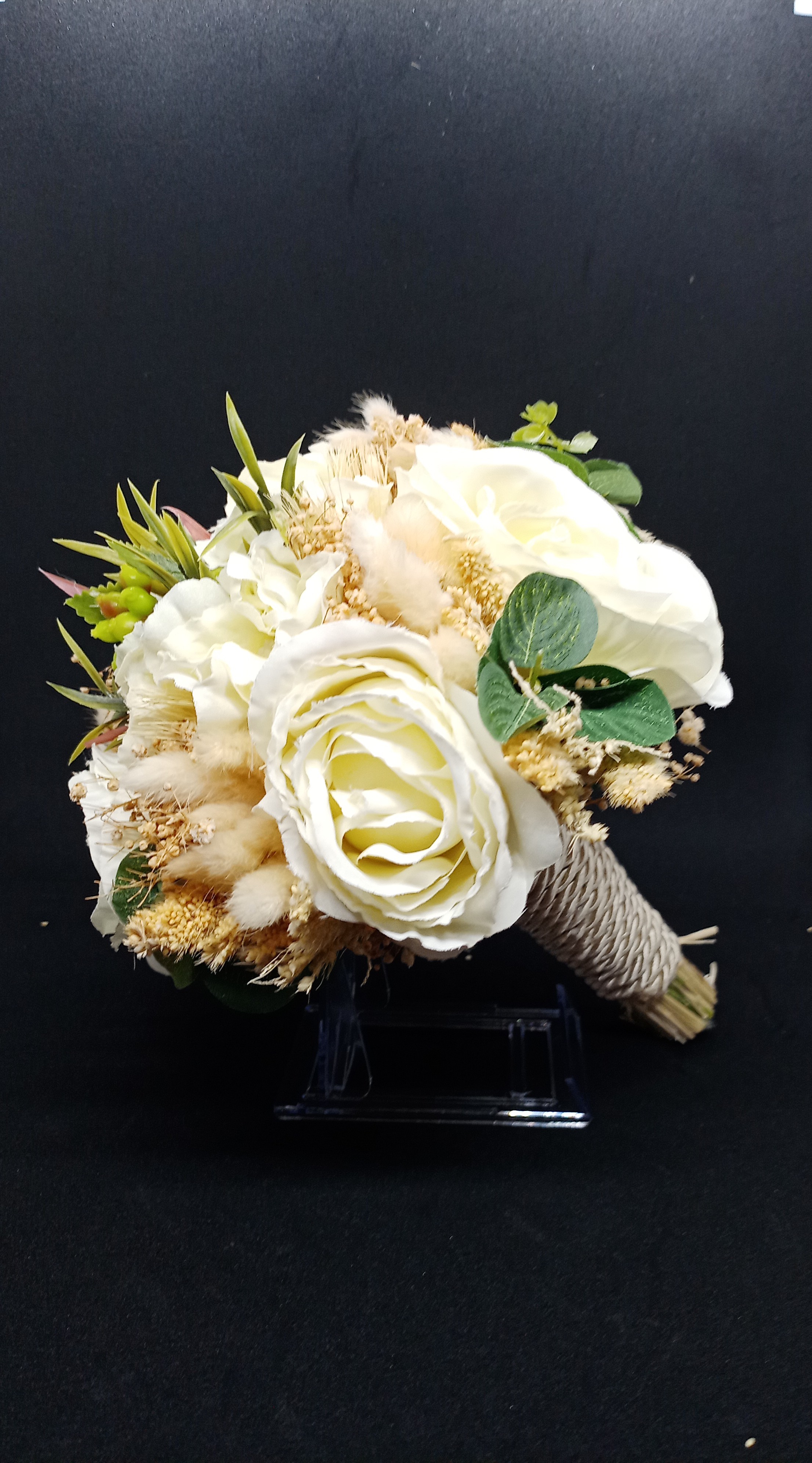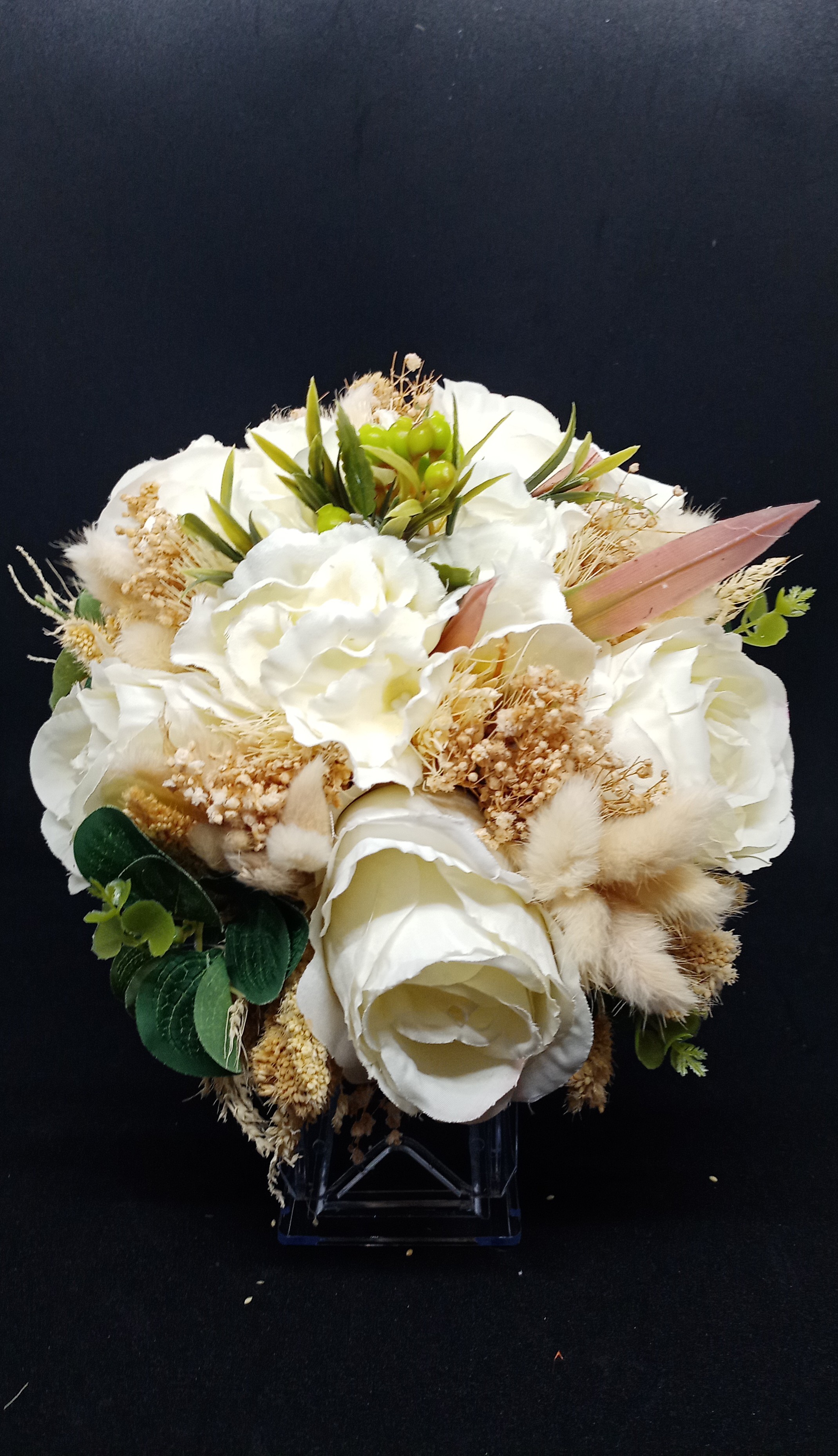 Krem cipsolarla süslenmiş yaprak ve tavşan kuyruğu otu detayına sahip beyaz güllerden oluşan yapay gelin buketi.