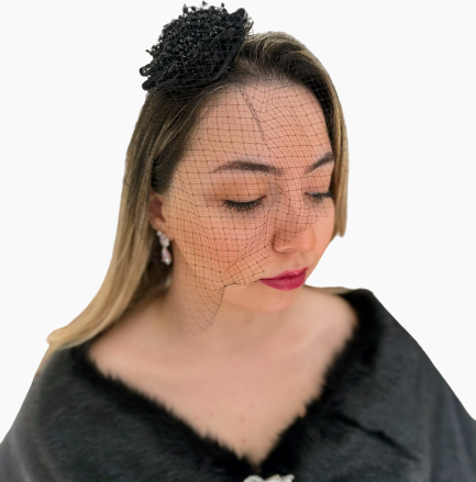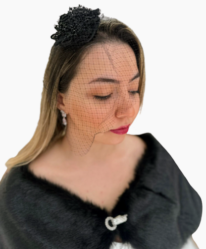 Siyah Kristal ve File Detaylı Vualet Şapka Nikah Kepi