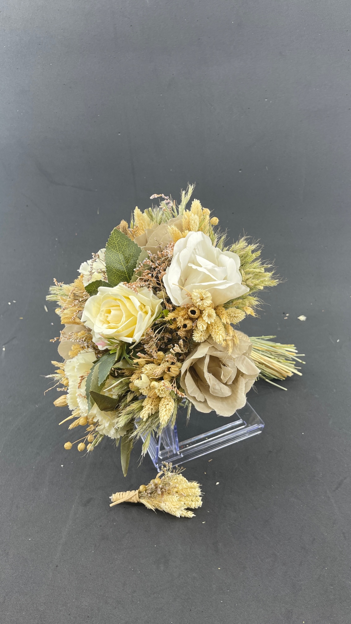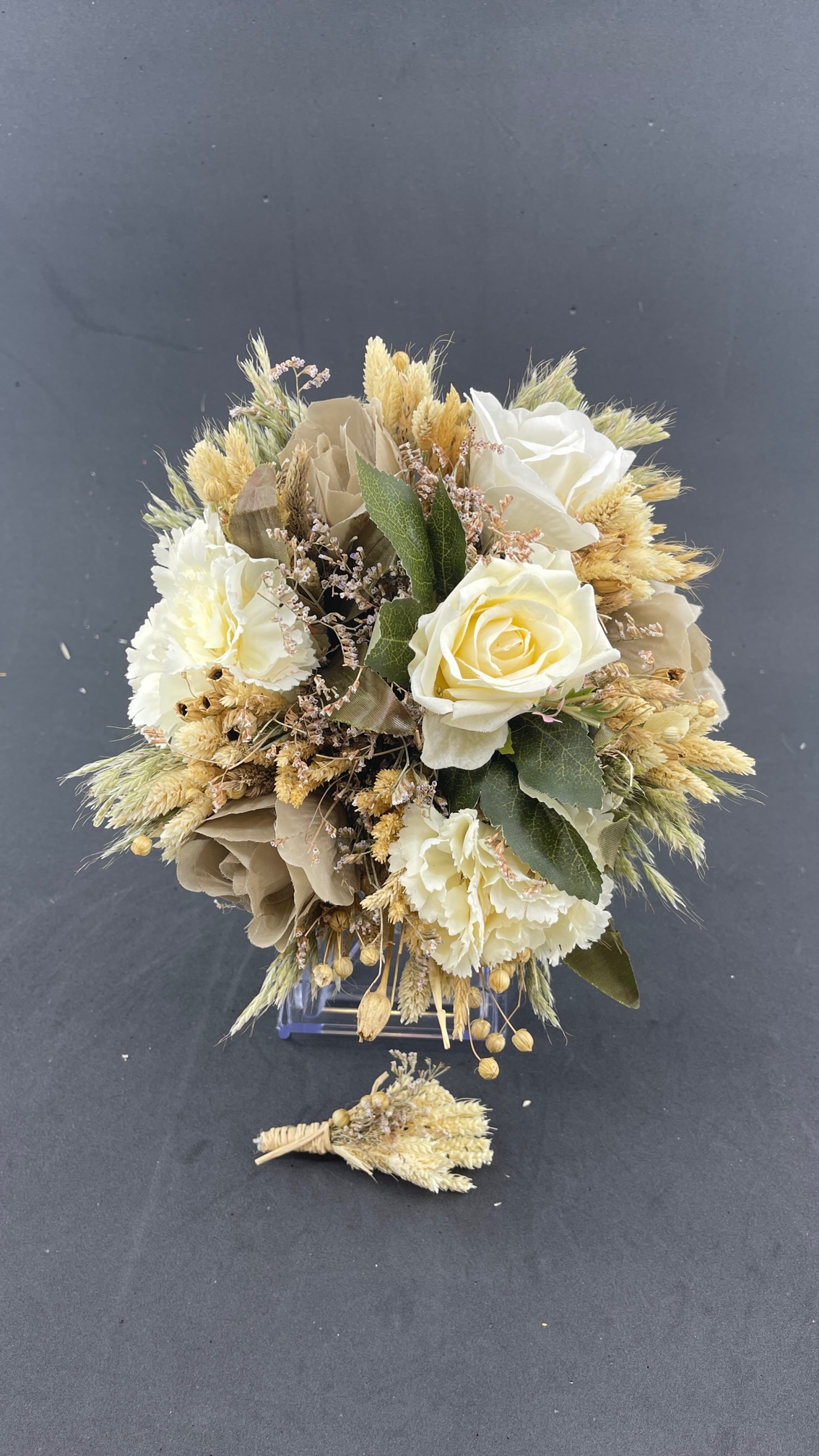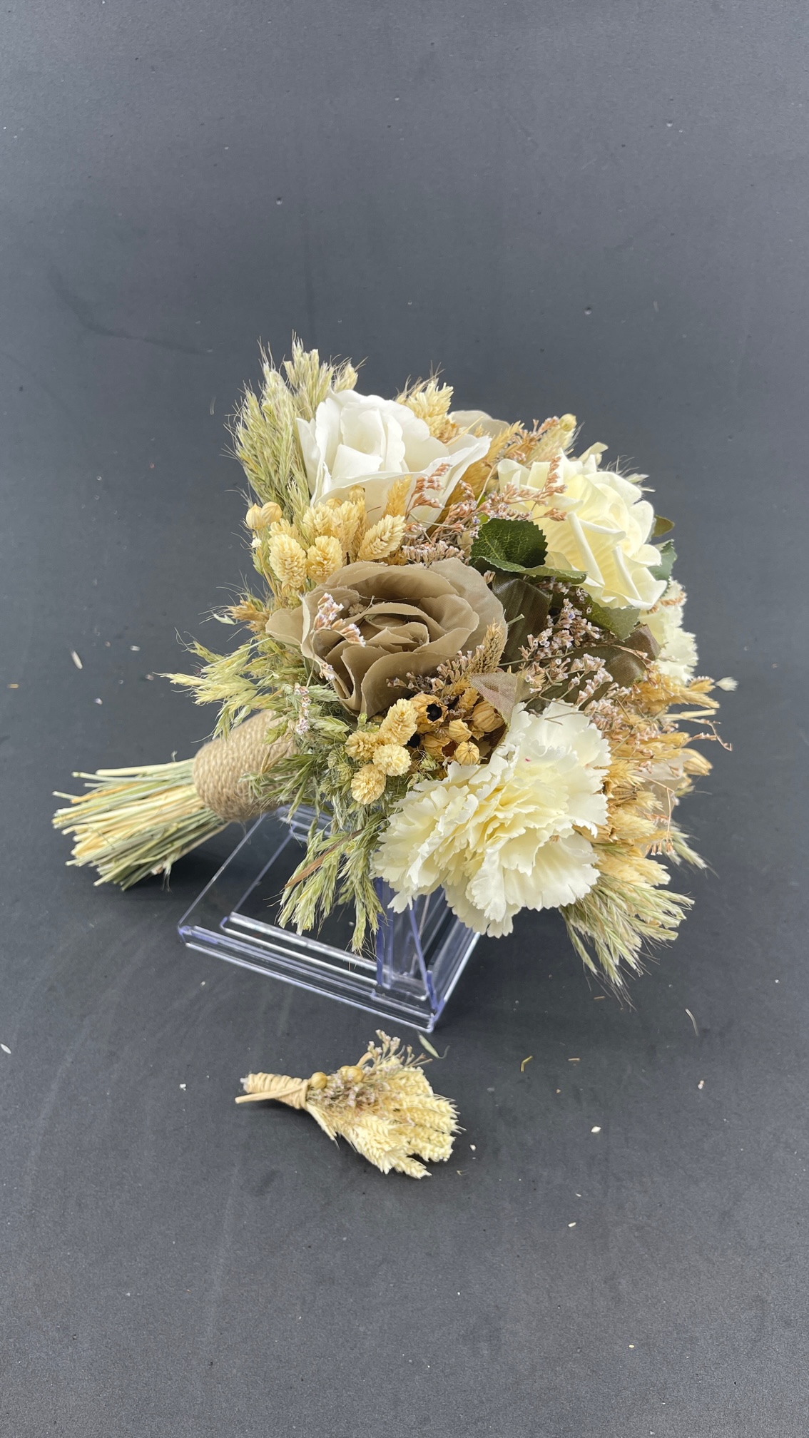Soft Renklerde Yeşil Yaprak Detaylı Aranjman Gelin Buketi Ve Damat Yaka Çiçeği