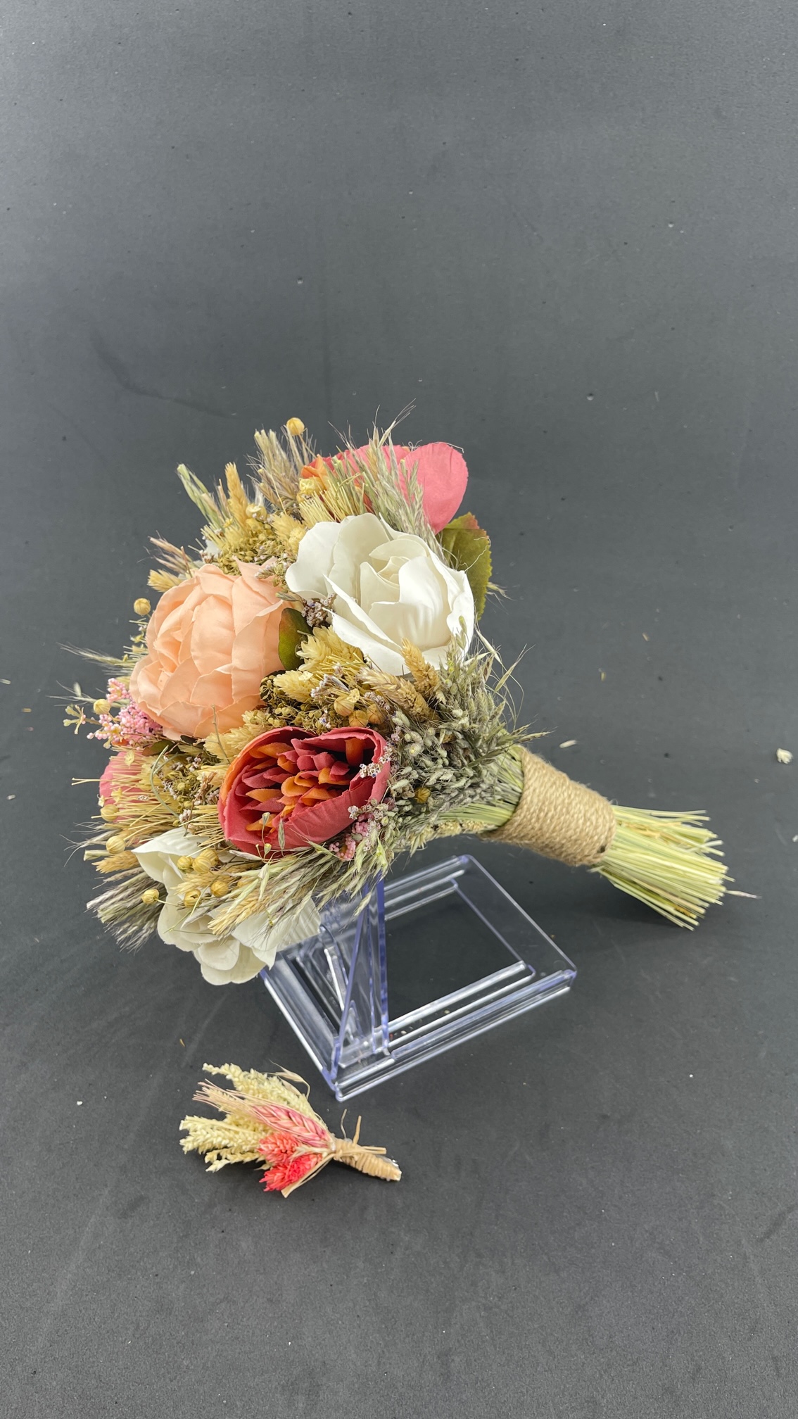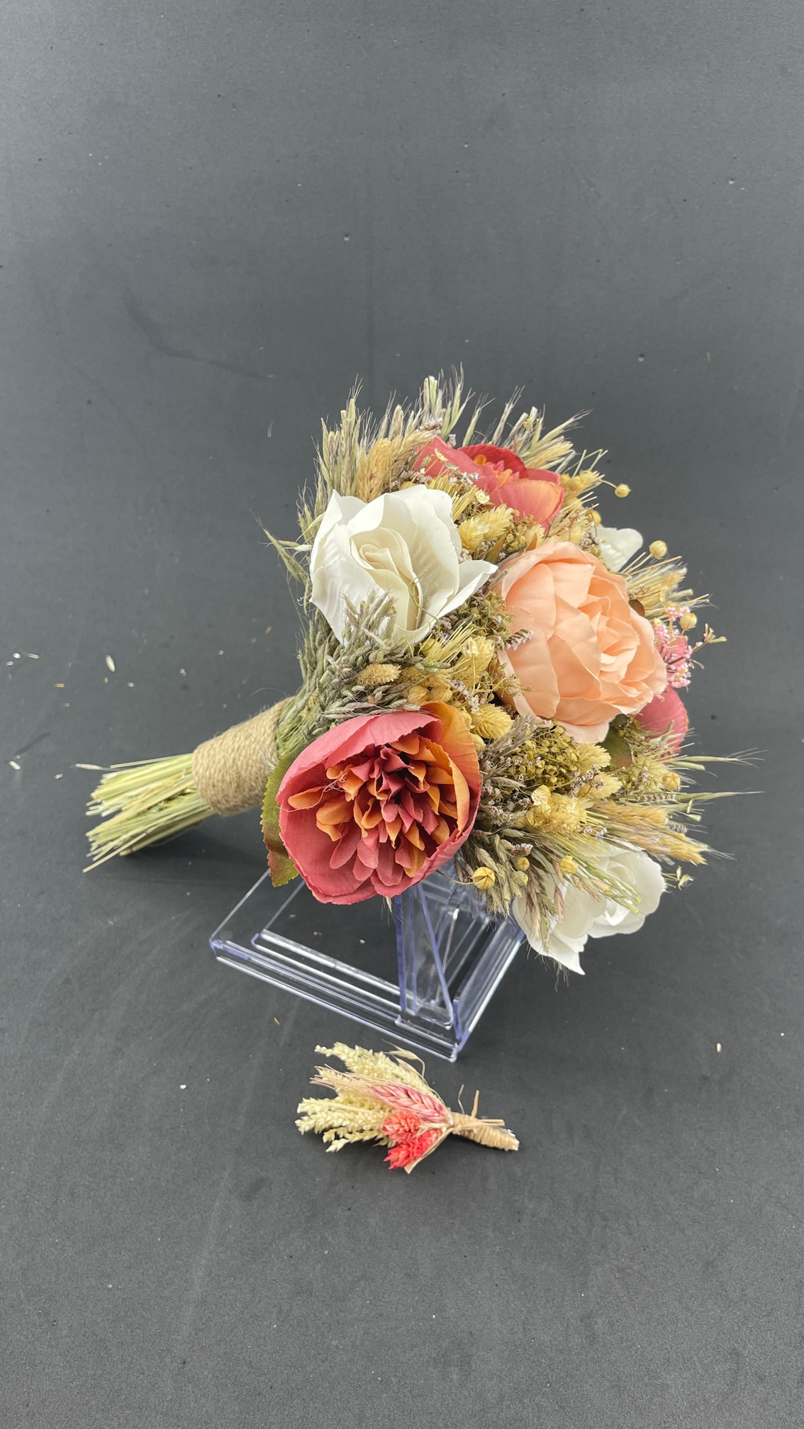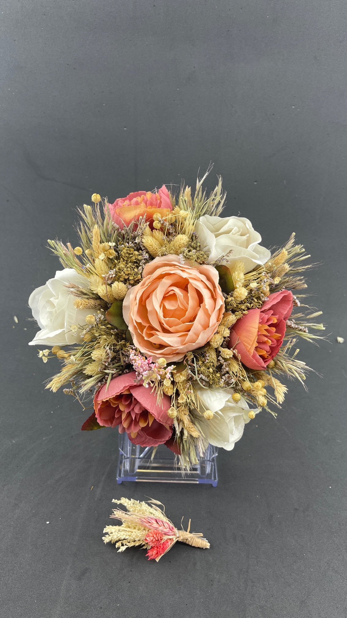 Somon Turuncu Pembe Canlı Tonlarda Gelin Gül Buketi ve Damat Yaka Çiçeği