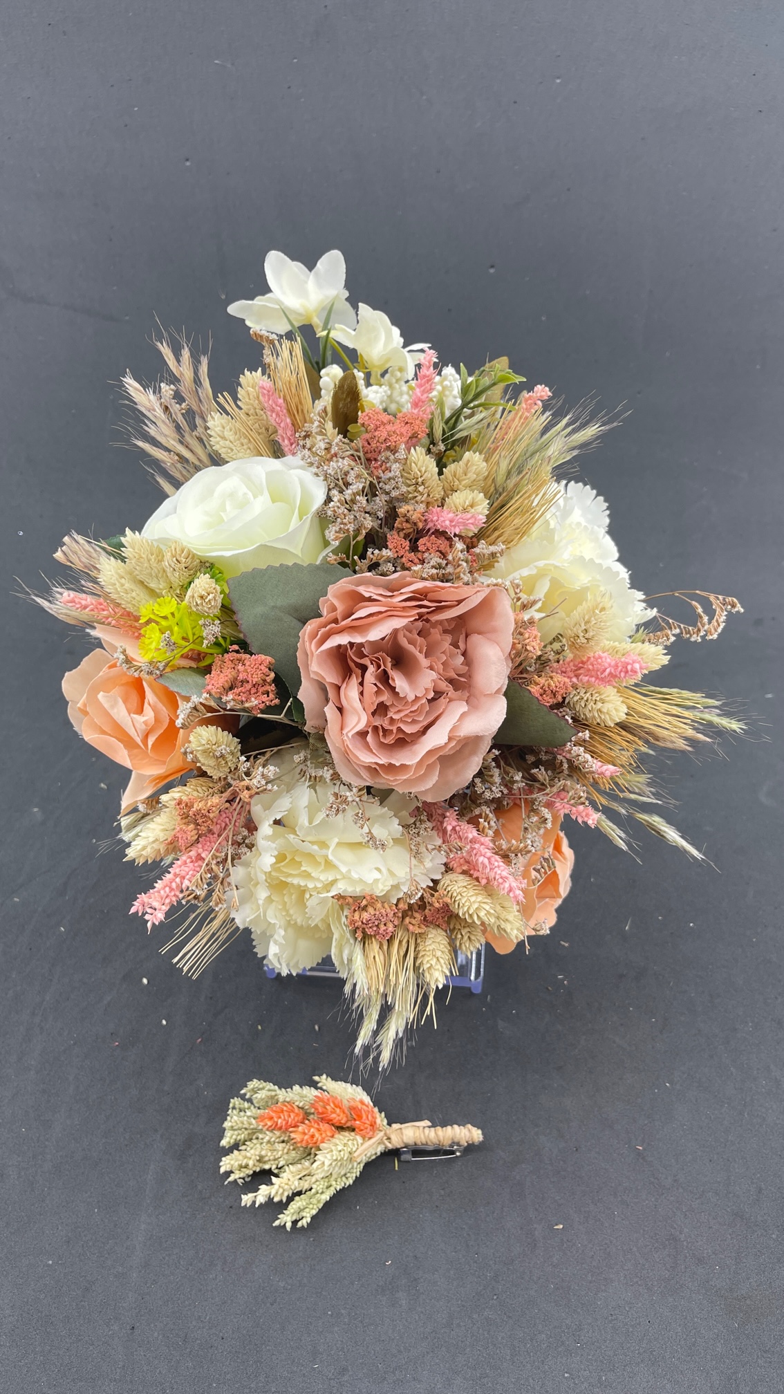 Somon Turuncu Pembe Tonlarda Çok Renkli Aranjman Gelin Buketi ve Damat Yaka Çiçeği