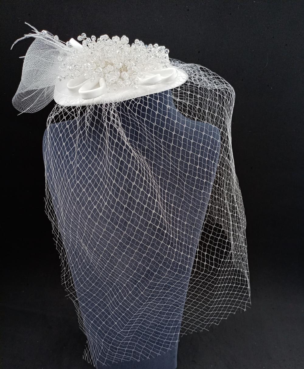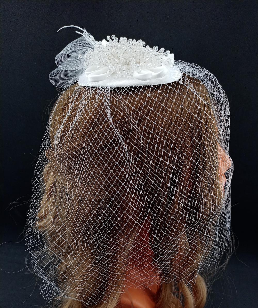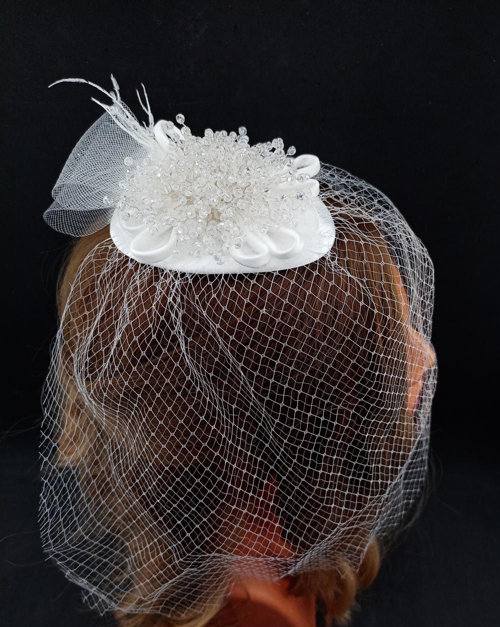 Top Kristallerle Süslenmiş Dantel Detaylı Beyaz Vualet Şapka Nikah Kepi