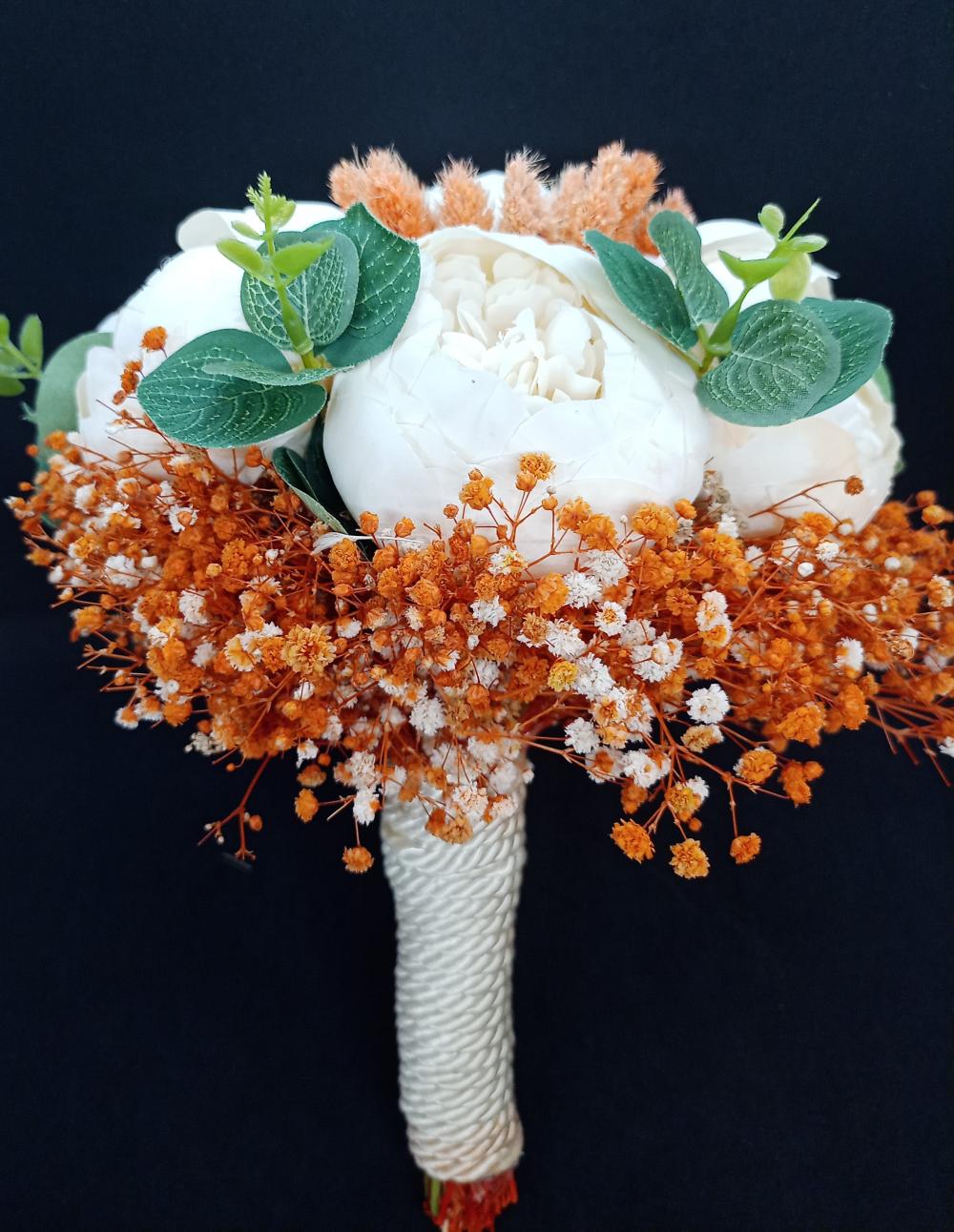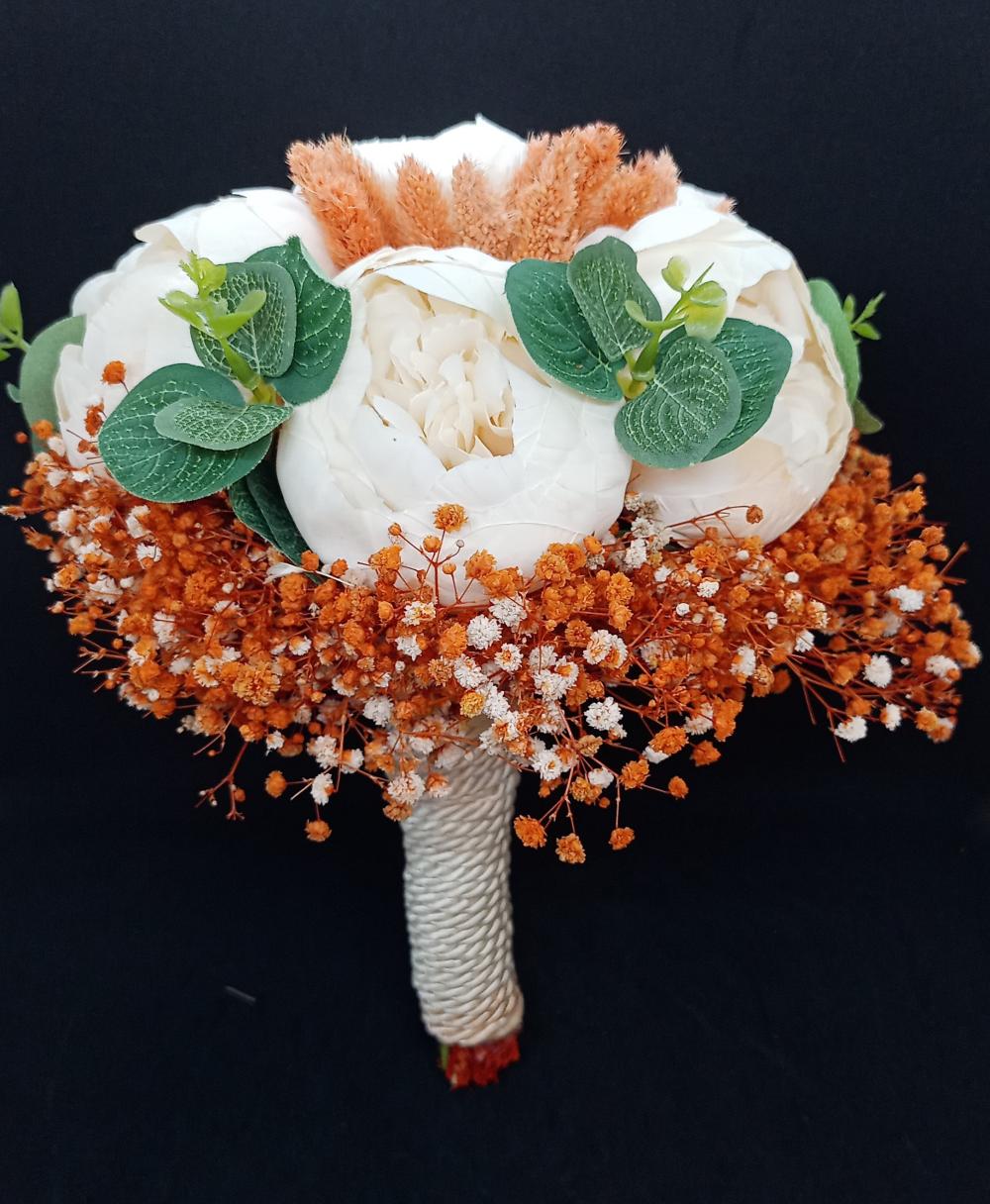 Turuncu Cipso Ve Bitkilerden Oluşan Beyaz Gül Gelin Buketi