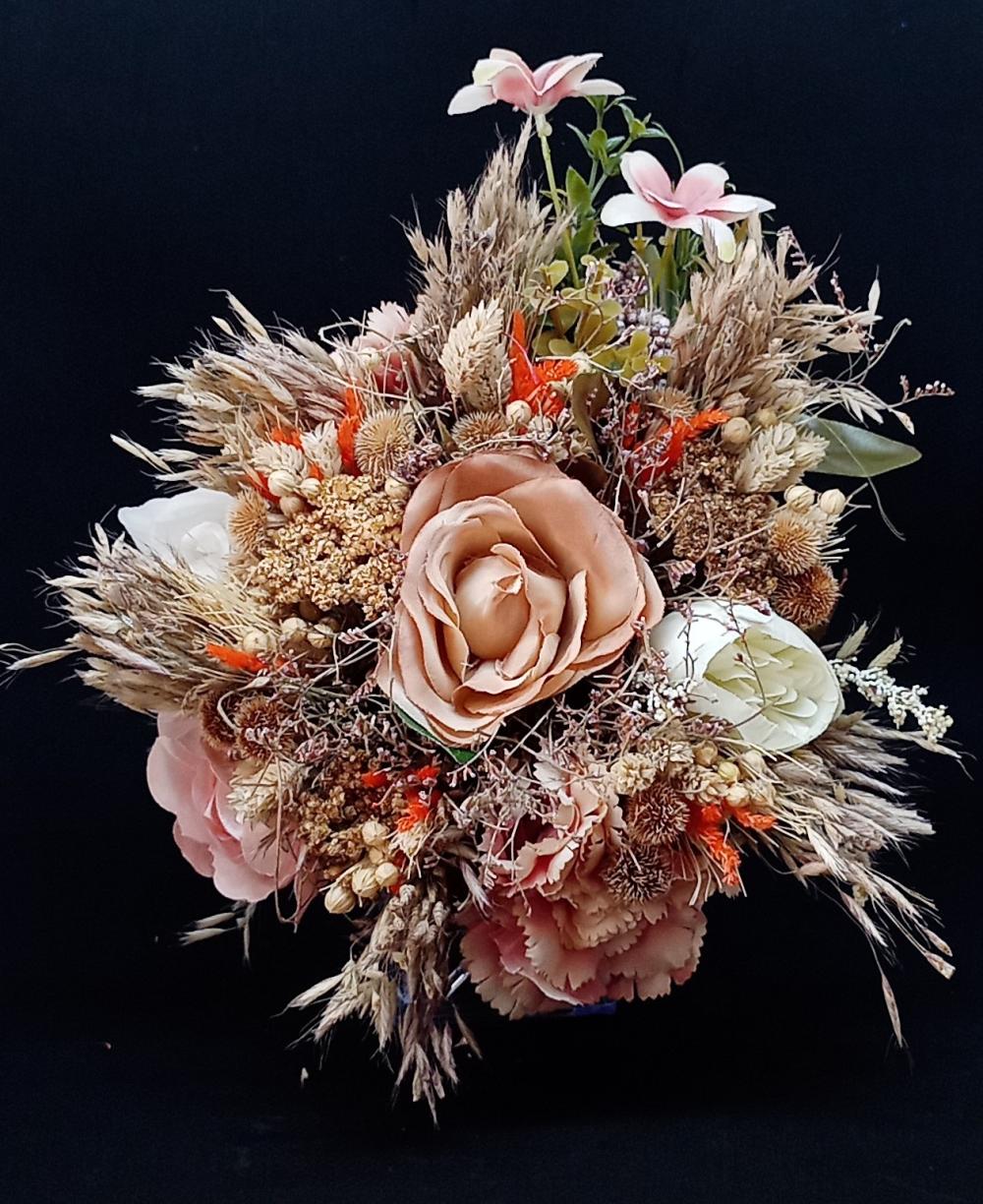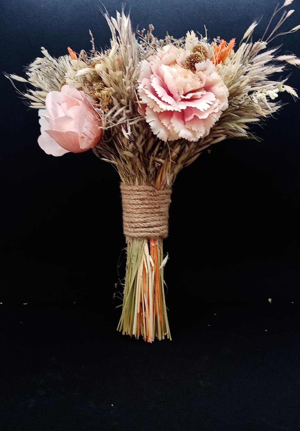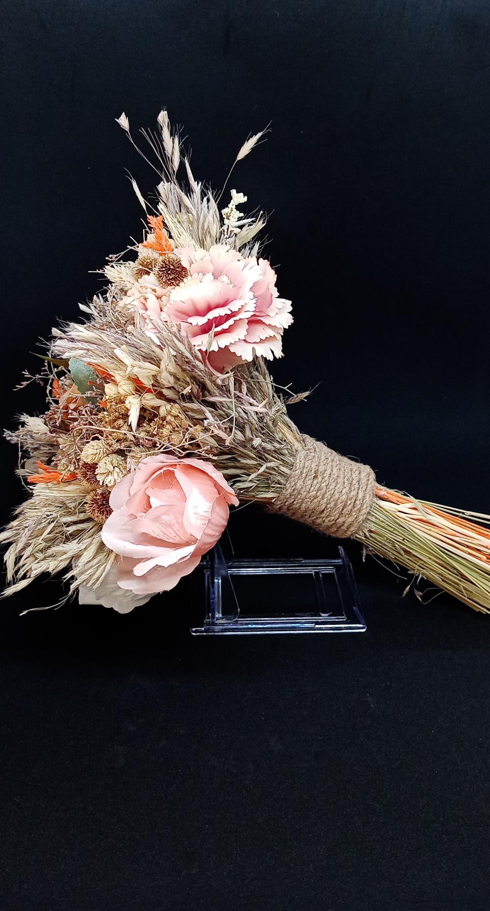 Turuncu detaylara sahip pembe beyaz gül ve karanfilden oluşan yapay gelin buketi.