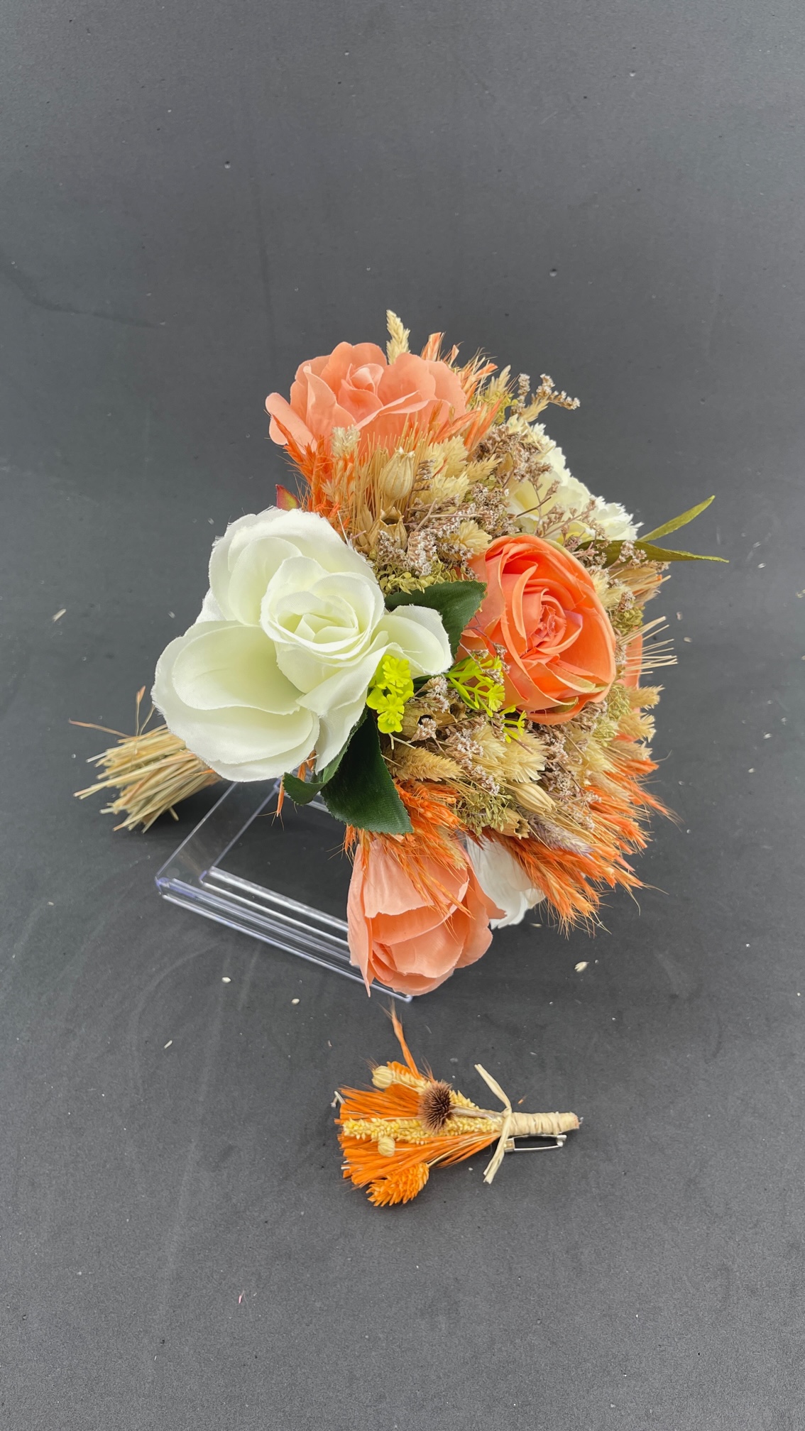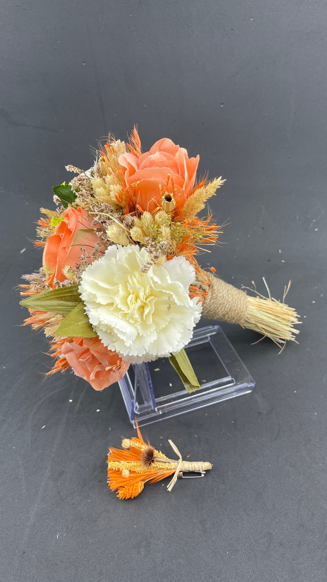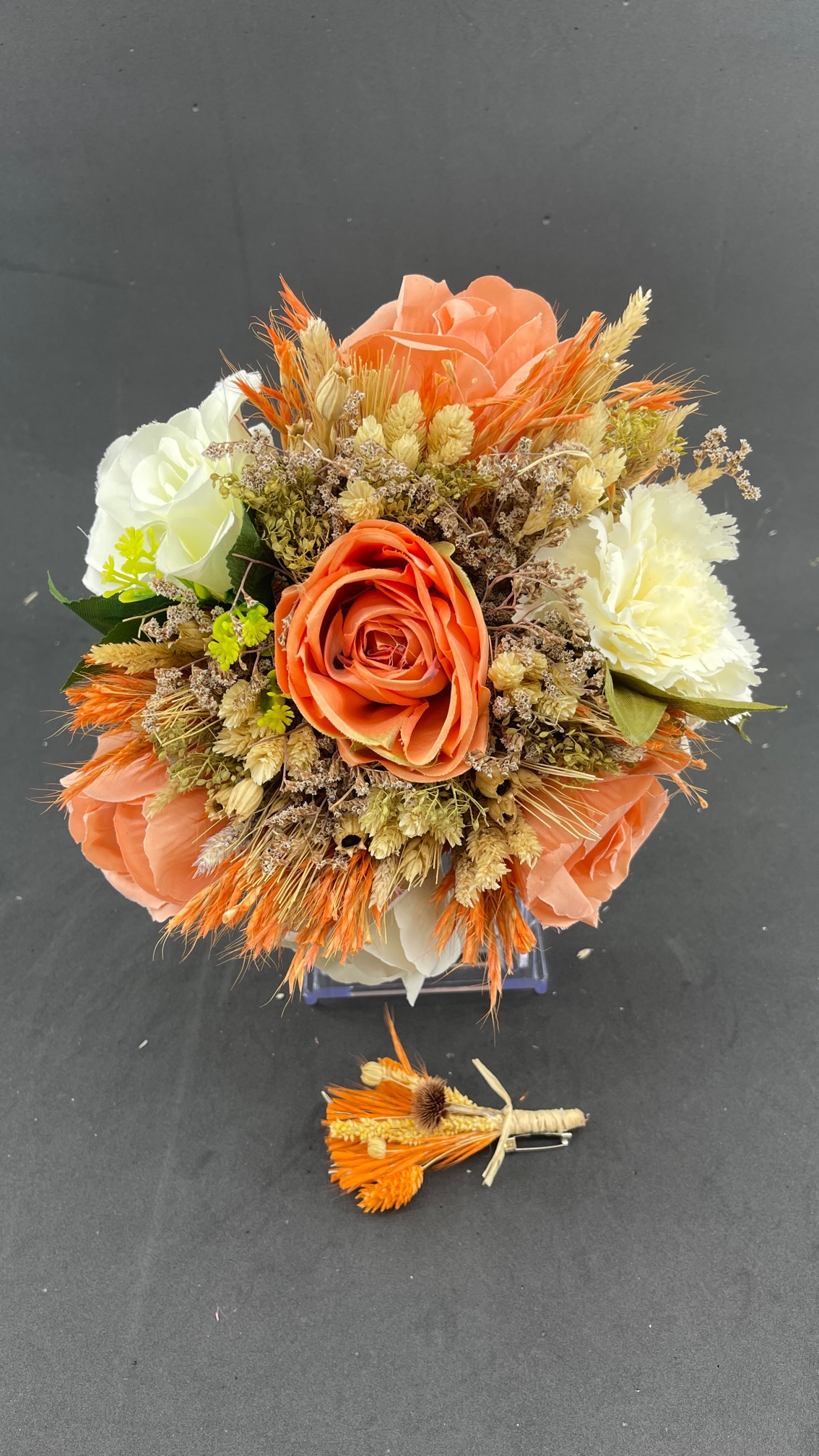 Turuncu Ekru Çiçeklerden Oluşan Aranjman Gelin Buketi Ve Damat Yaka Çiçeği