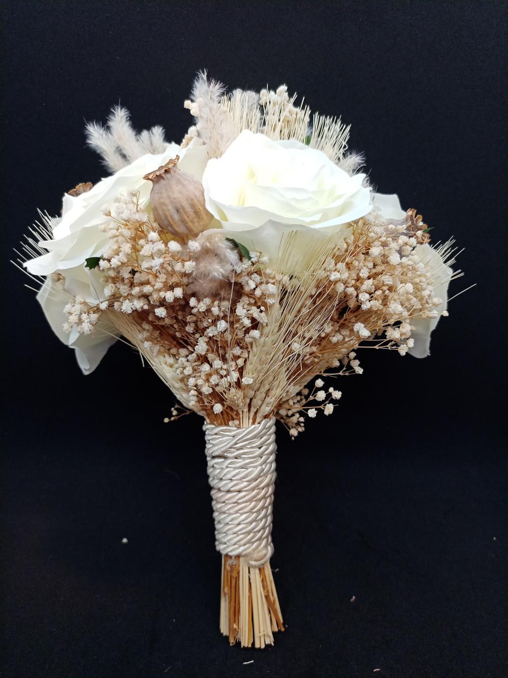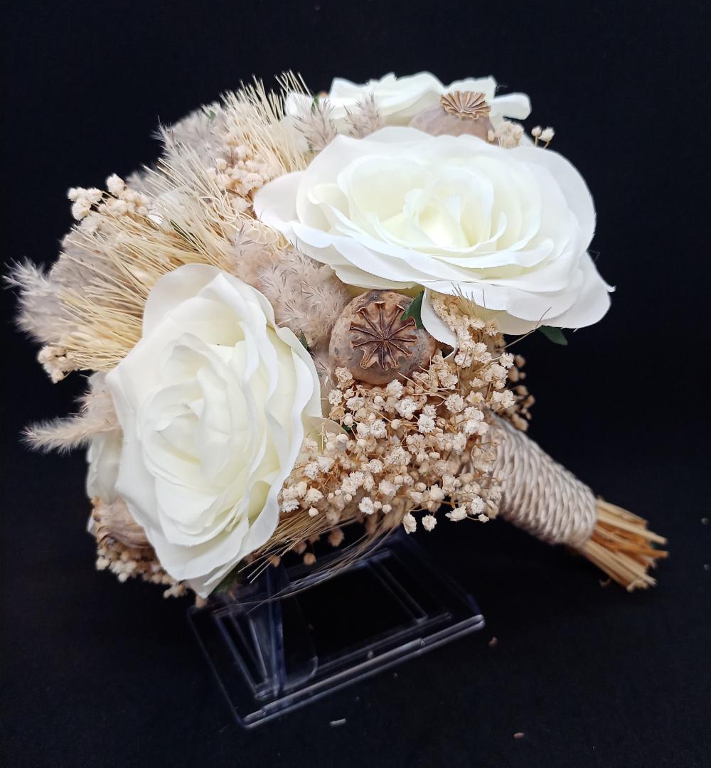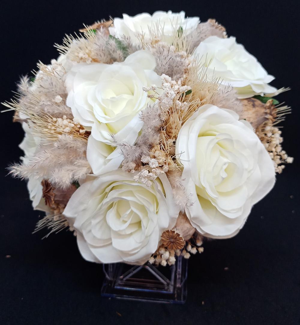 Krem rengi cipsolarla süslenmiş tüy detaylarına sahip beyaz güllerden oluşan yapay gelin buketi.