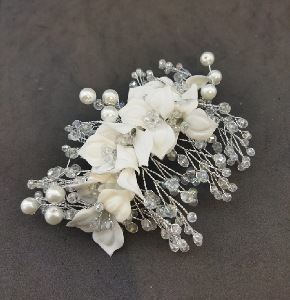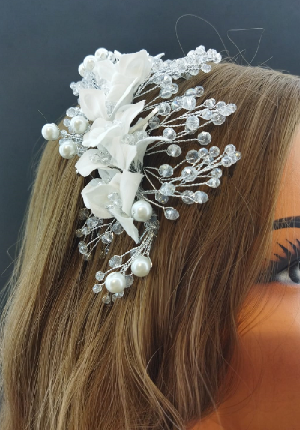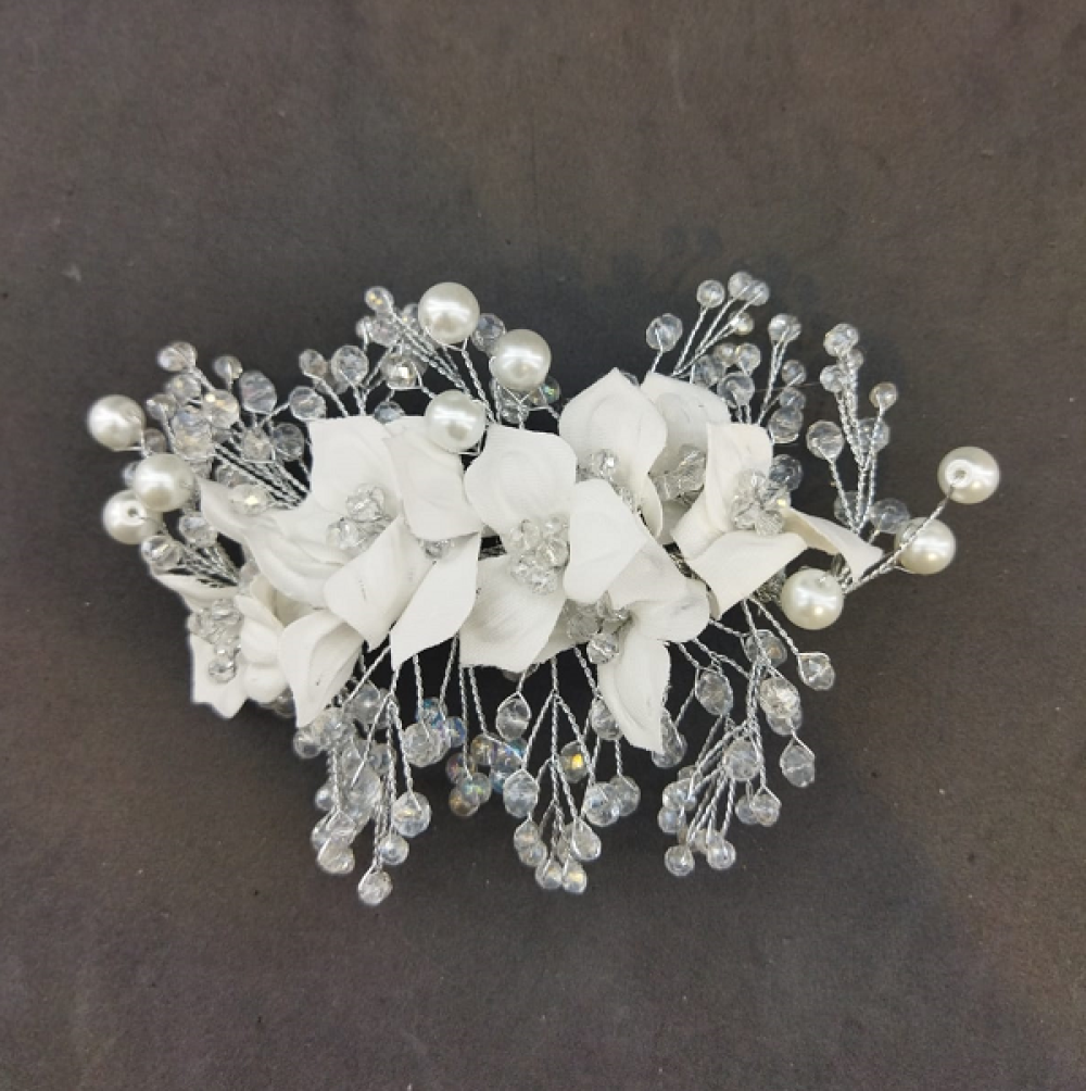 Üç Taç Yapraklı Çiçeklerden Oluşan Kristal Ve İncili Gelin Tokası