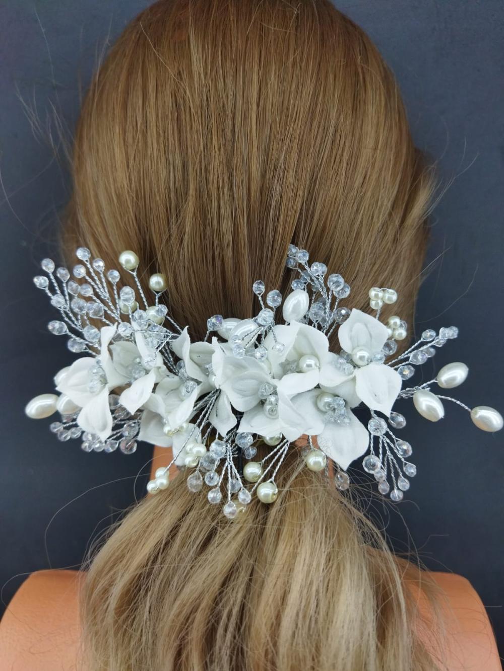 Uzun İnciler Ve Kristallerle Süslenmiş Beyaz Gala Gelin Saç Tokası