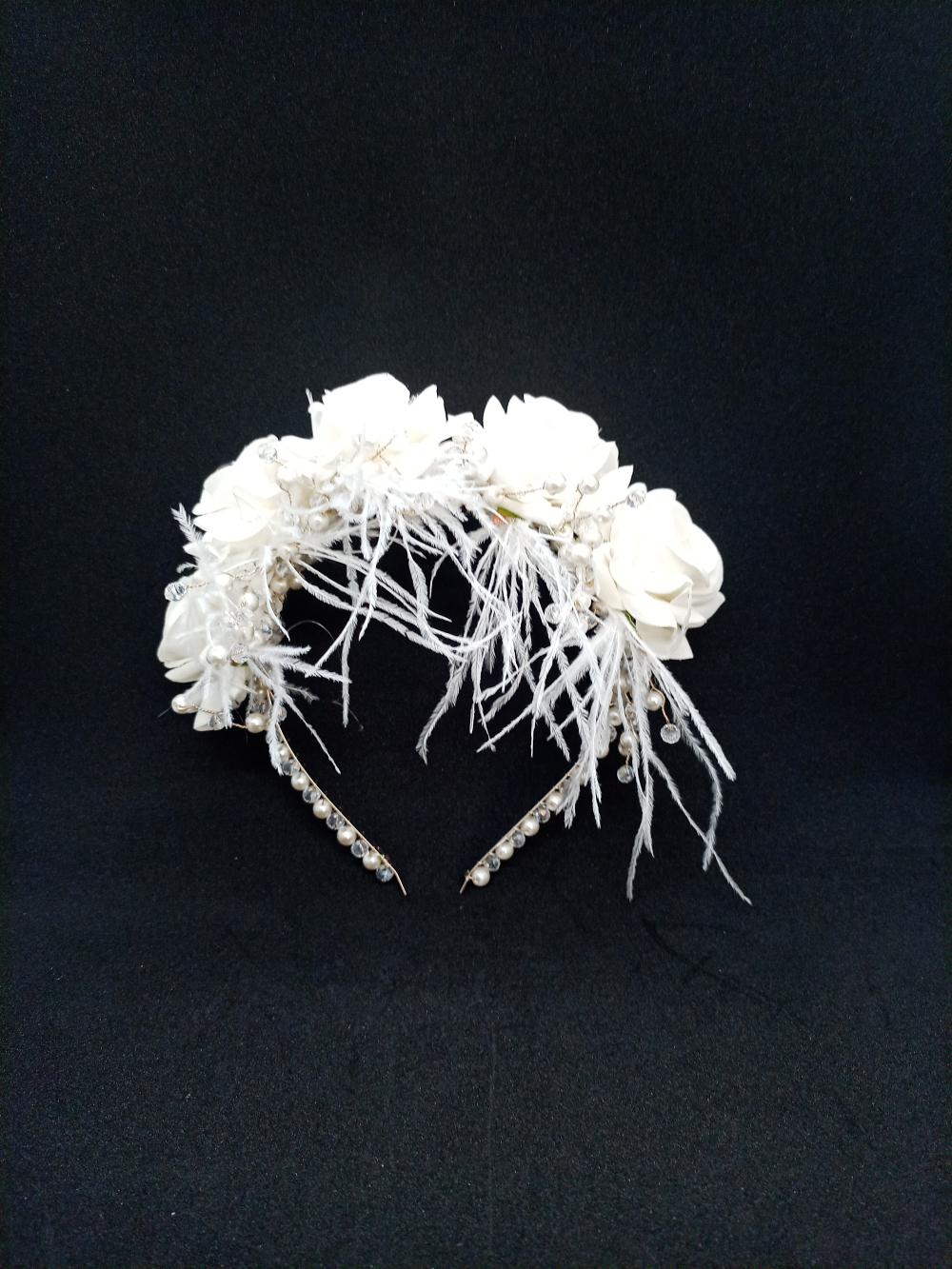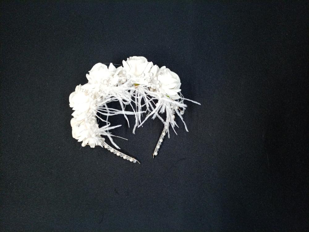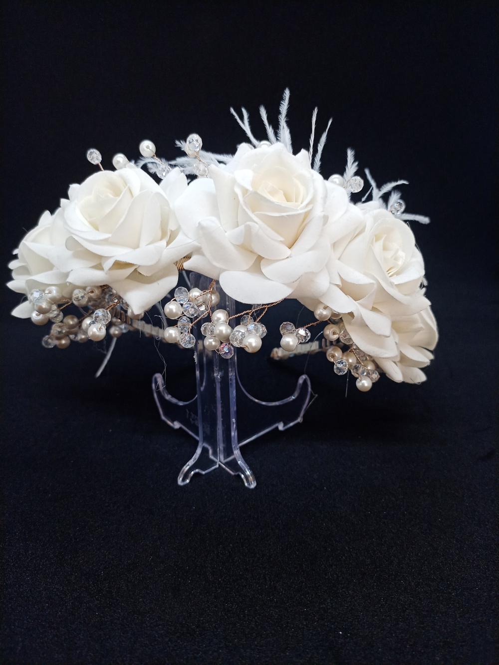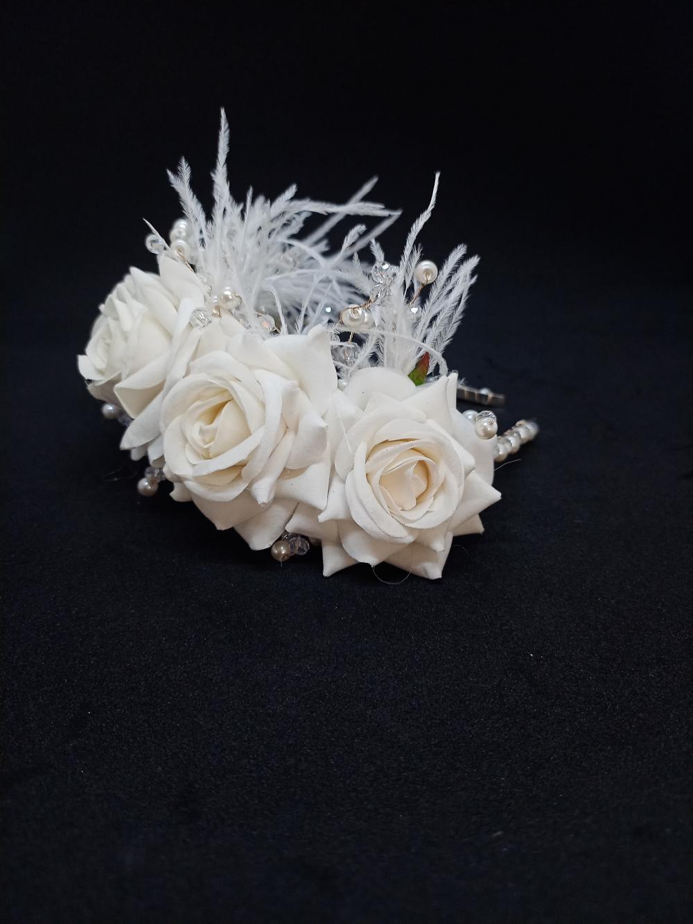 Yapay Güllerden Oluşan Tüylü Ve İncili Gelin Tacı