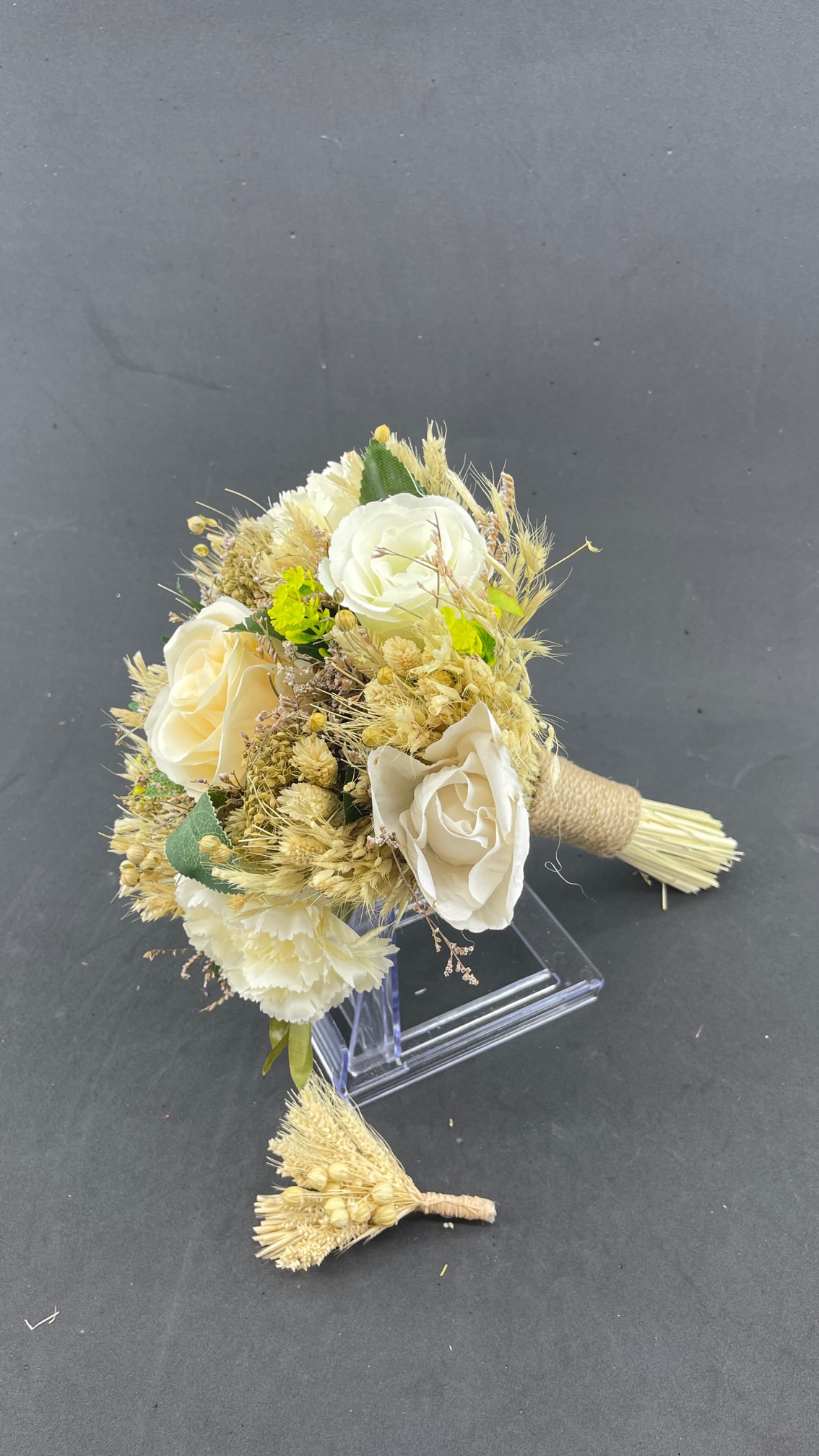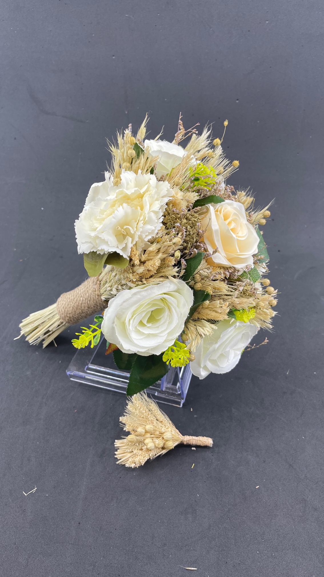 Yapraklarla Süslenmiş Krem Beyaz Aranjman Gül Gelin Buketi Ve Damat Yaka Çiçeği