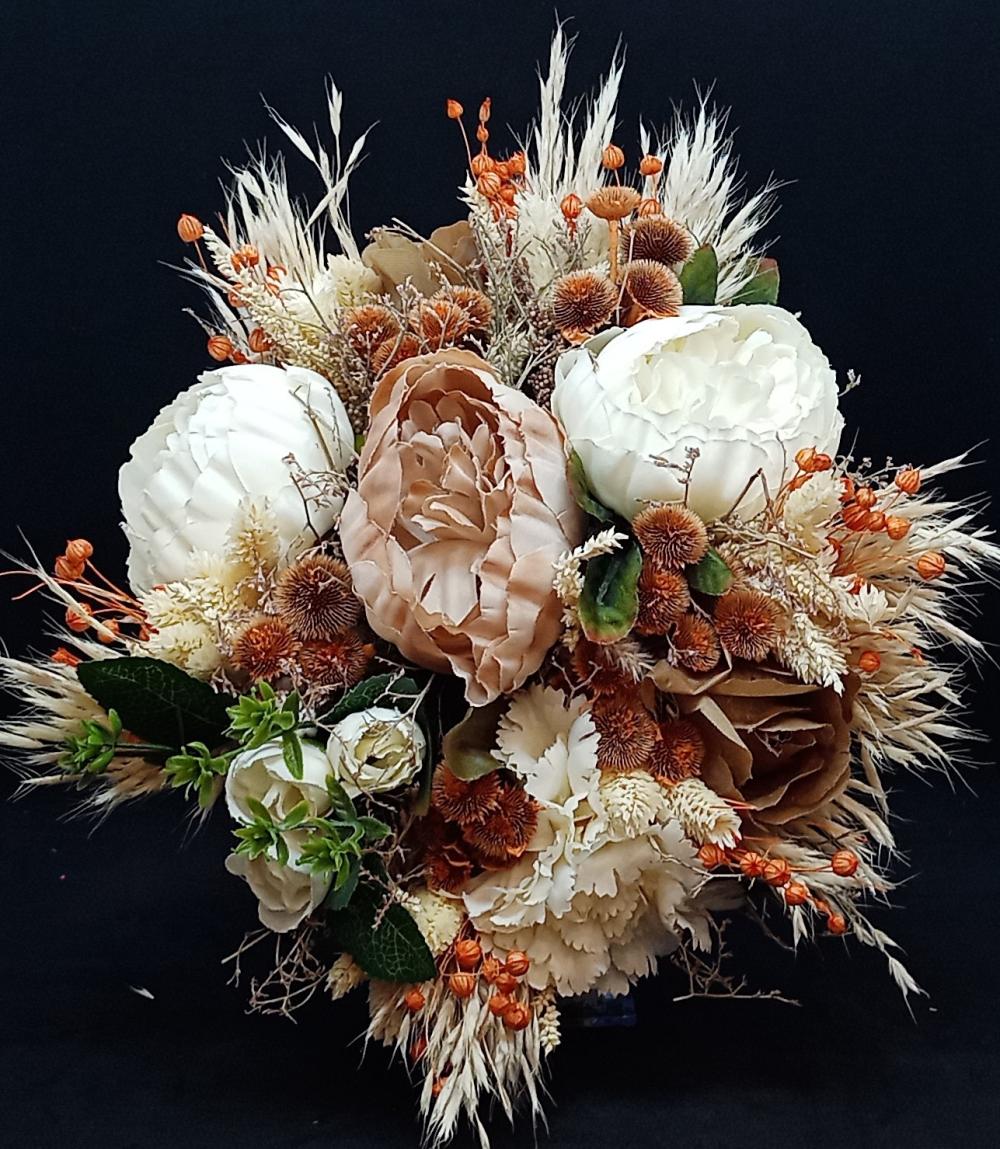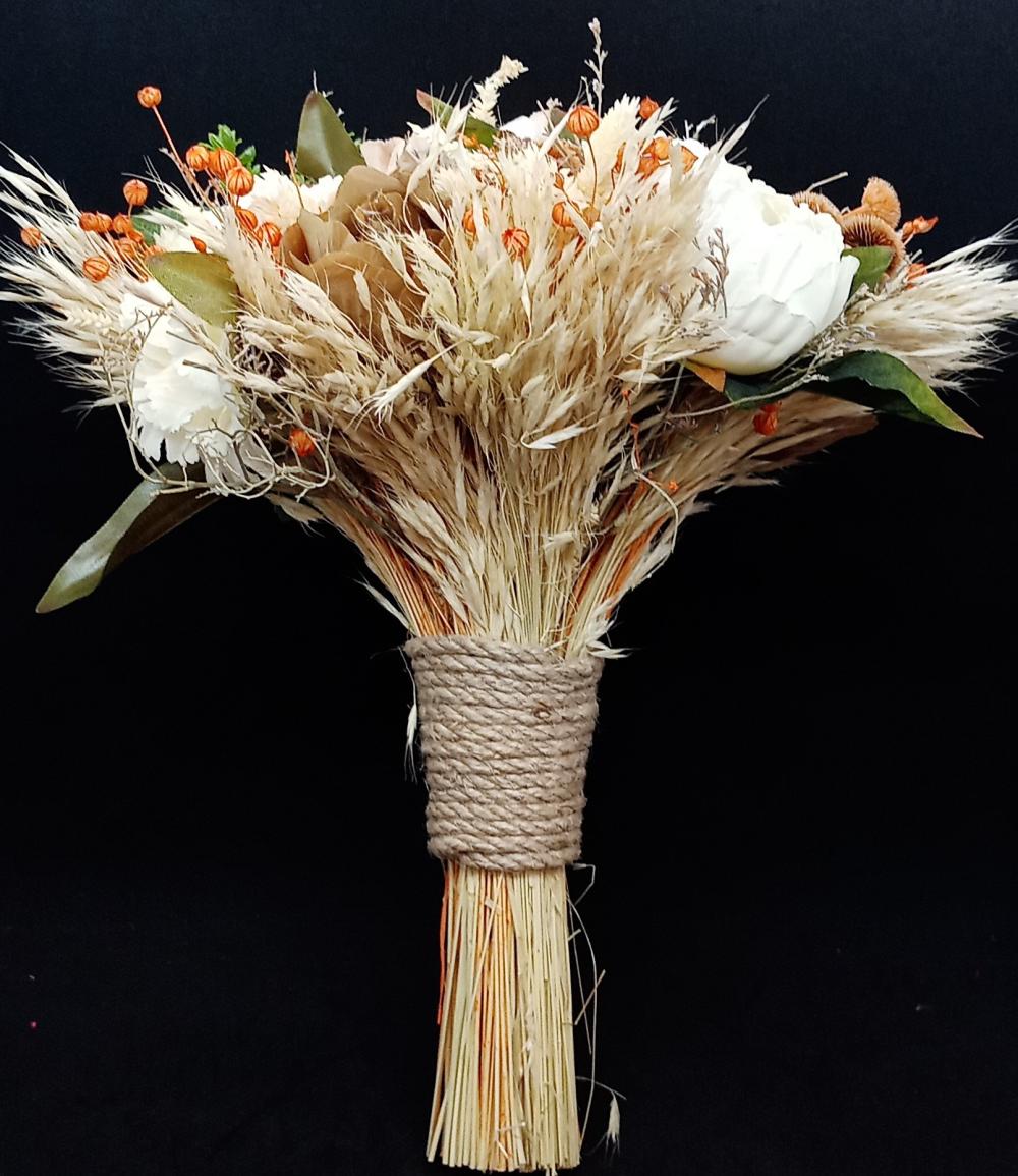 Gül ve karanfillerden oluşan yapay gelin buketi.