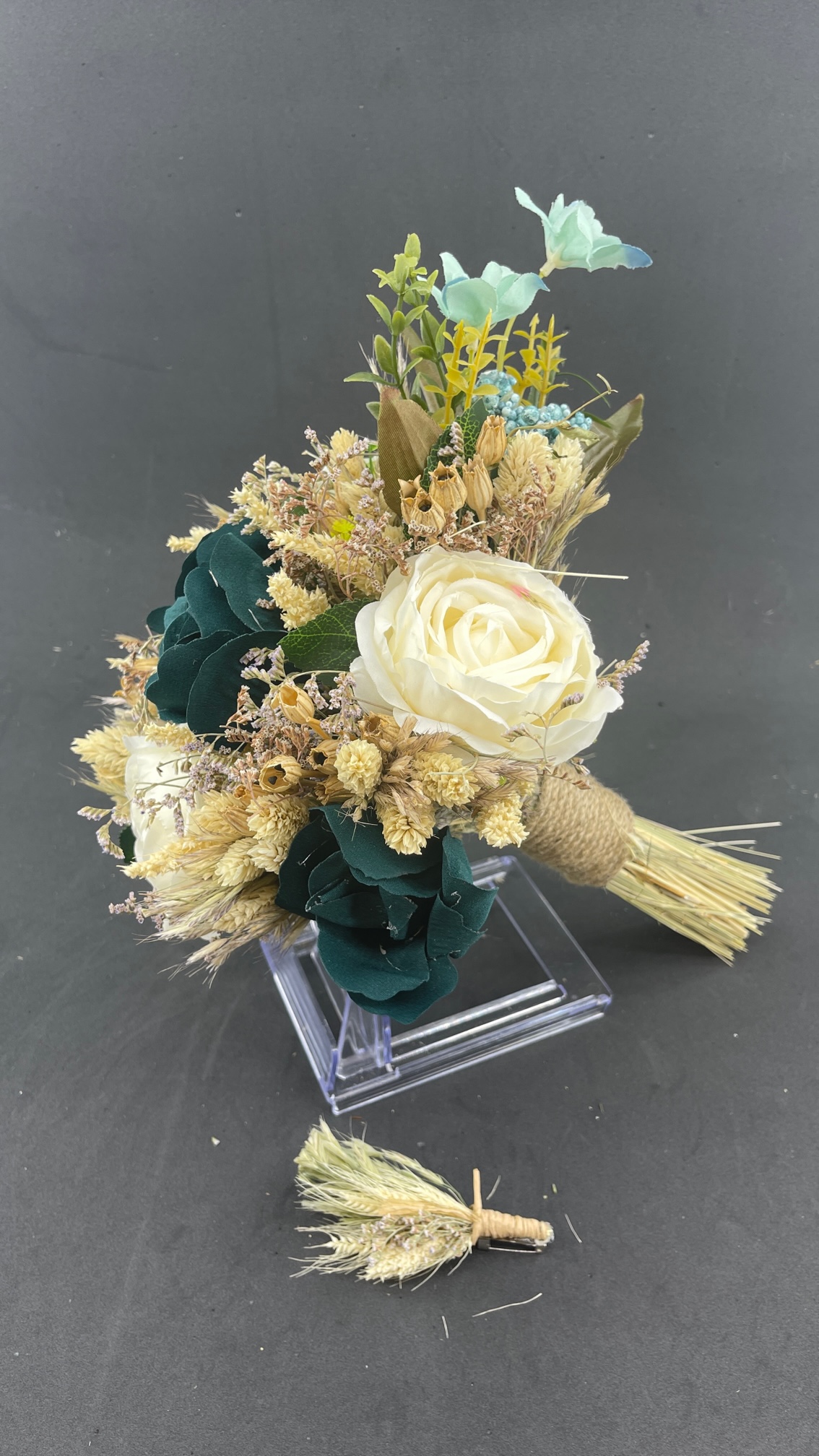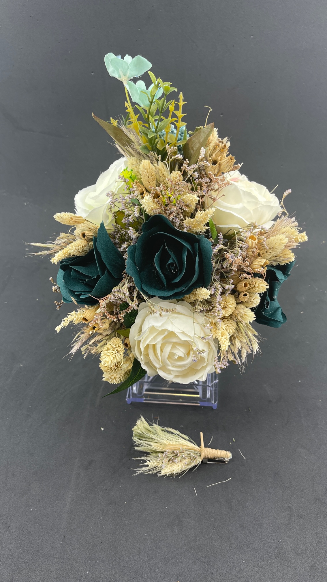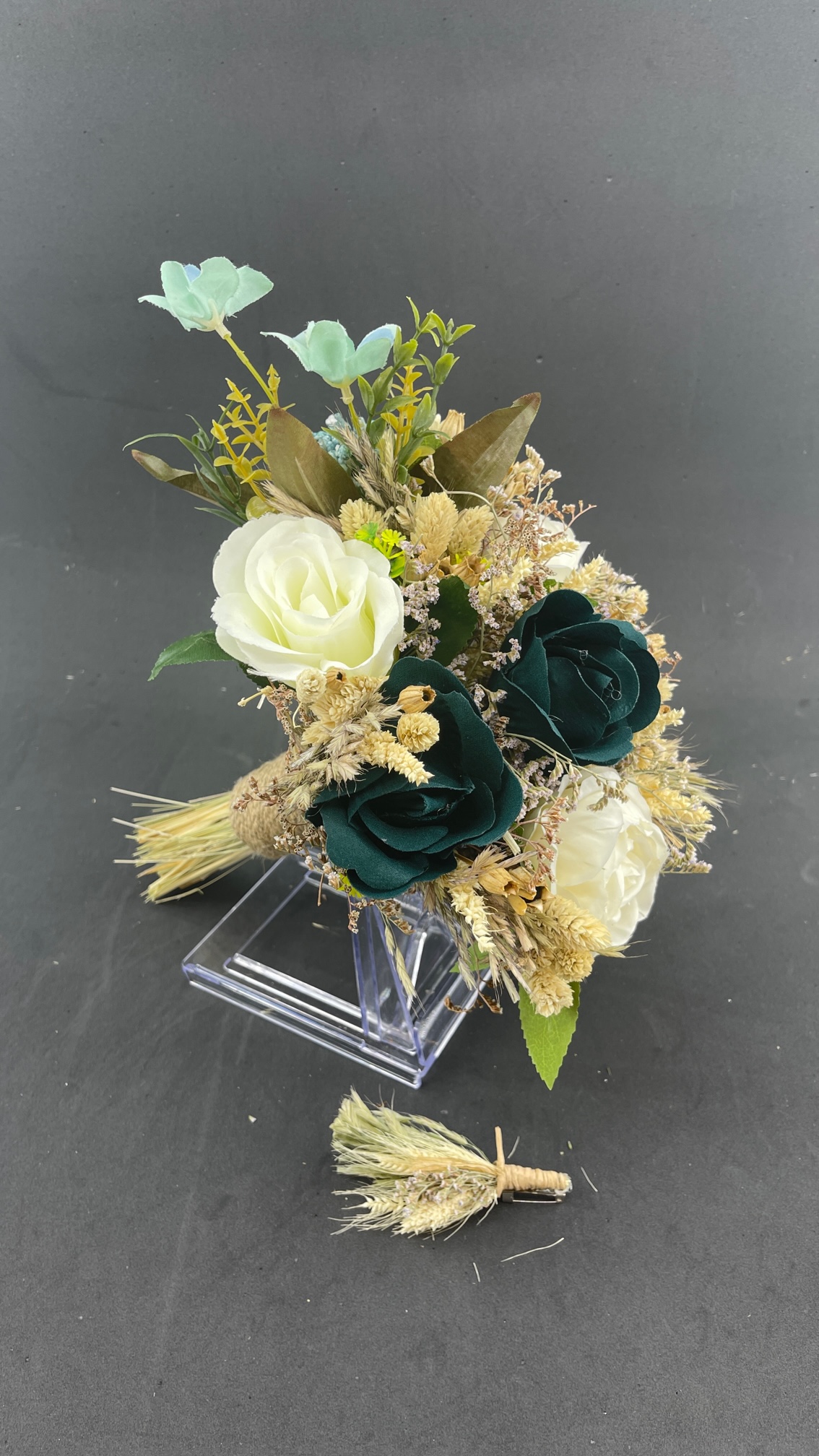 Yeşil Gül Detaylı Aranjman Gelin Buketi ve Damat Yaka Çiçeği