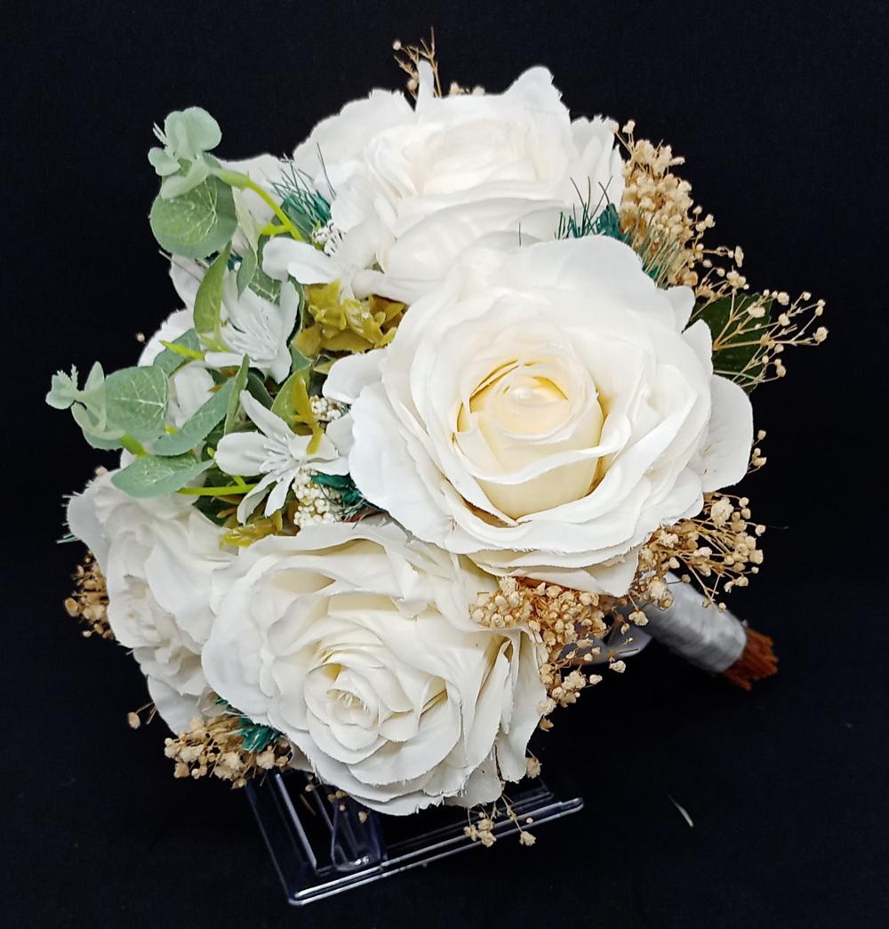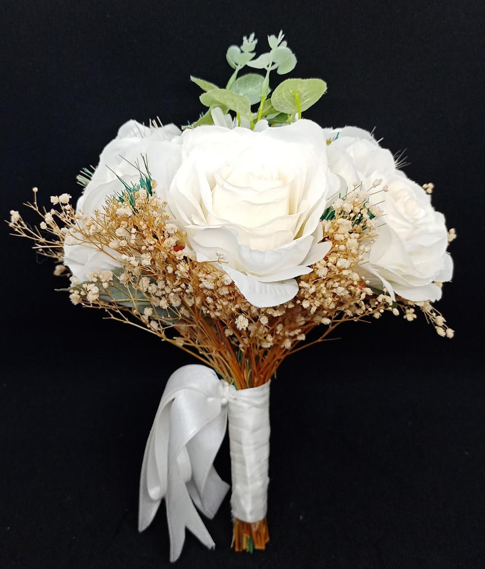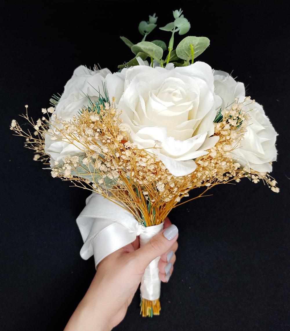 Krem rengi cipsolardan oluşan kurdele detaylı beyaz gül yapay gelin buketi.