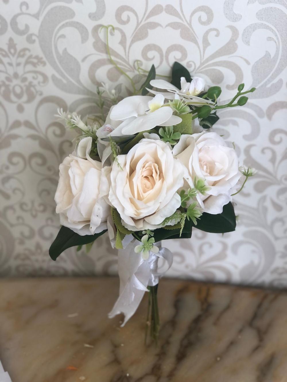 Yeşil Yaprak Detaylı Beyaz Gül Ve Manolya Gelin Buketi .