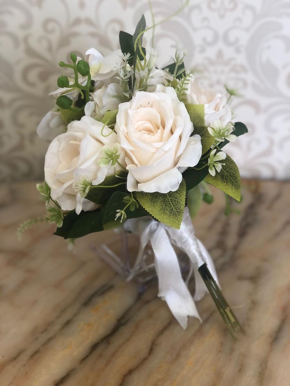 Yeşil yapraklarla süslenmiş beyaz kurdele detaylı soft tonlarda gül yapay gelin buketi.