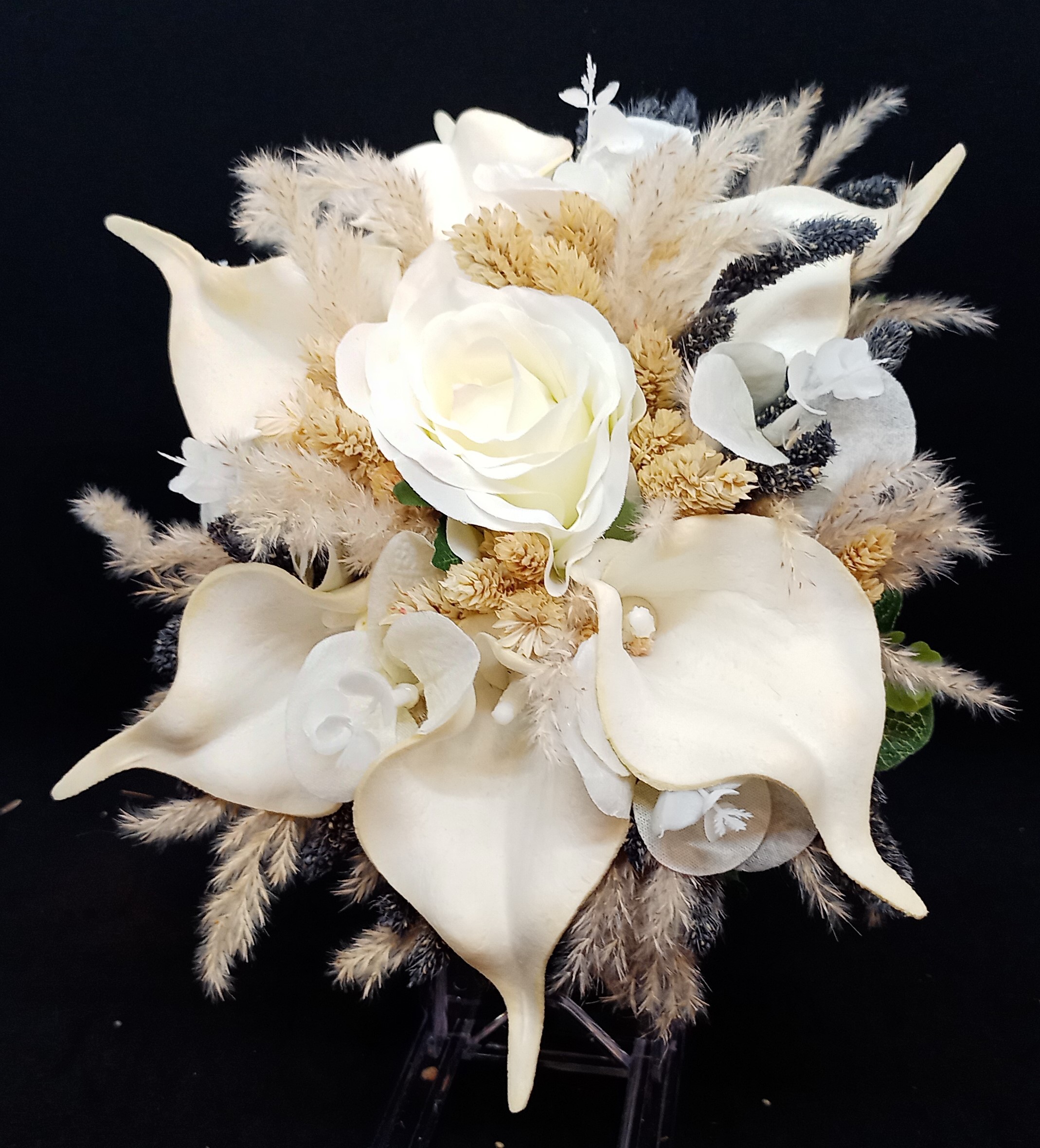 Tüy detayları olan beyaz gala ve gülden oluşan yapay gelin buketi.