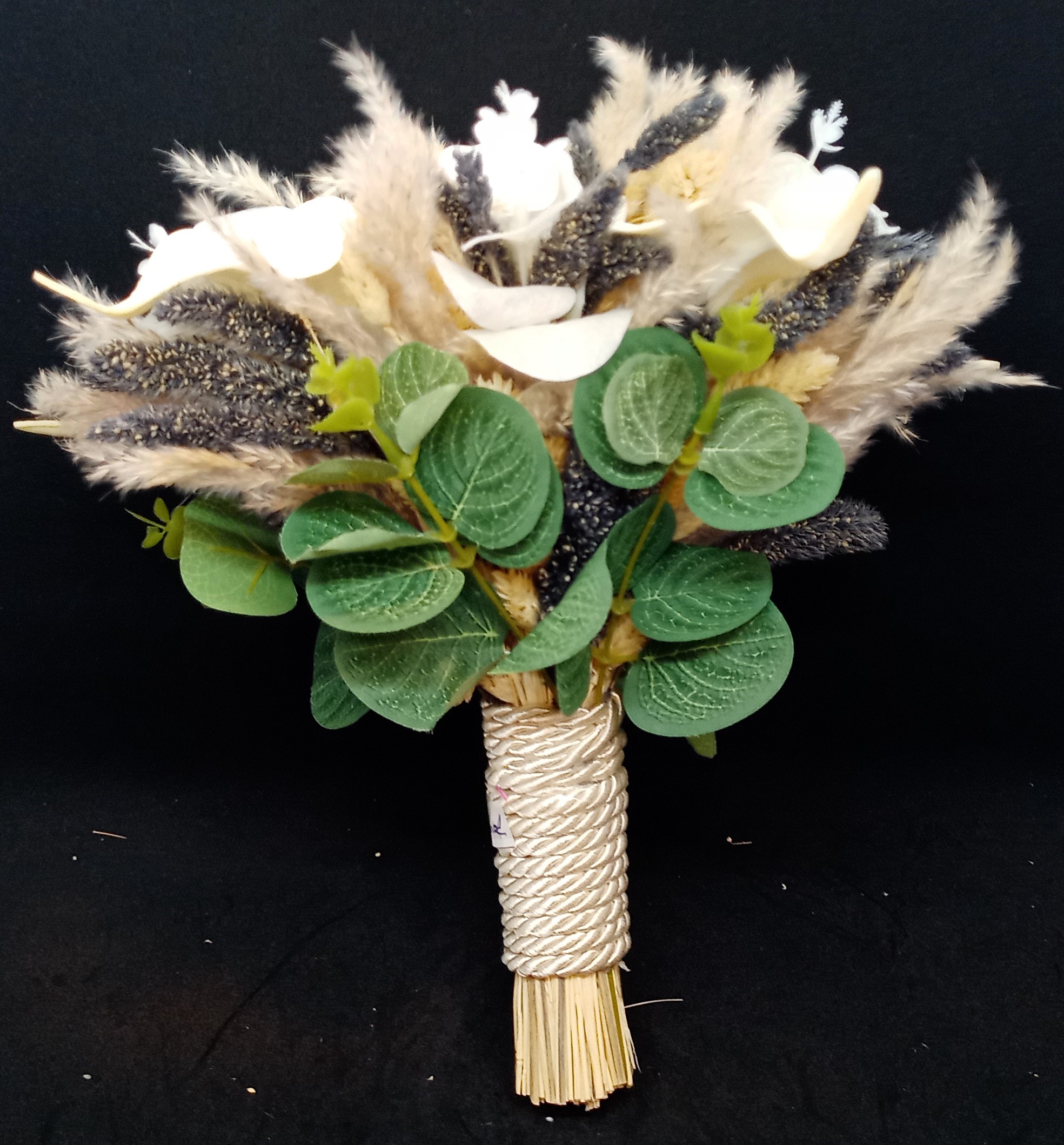 Yeşil Yaprak ve Cipsolarla Süslenmiş Krem Gala Gelin Buketi .