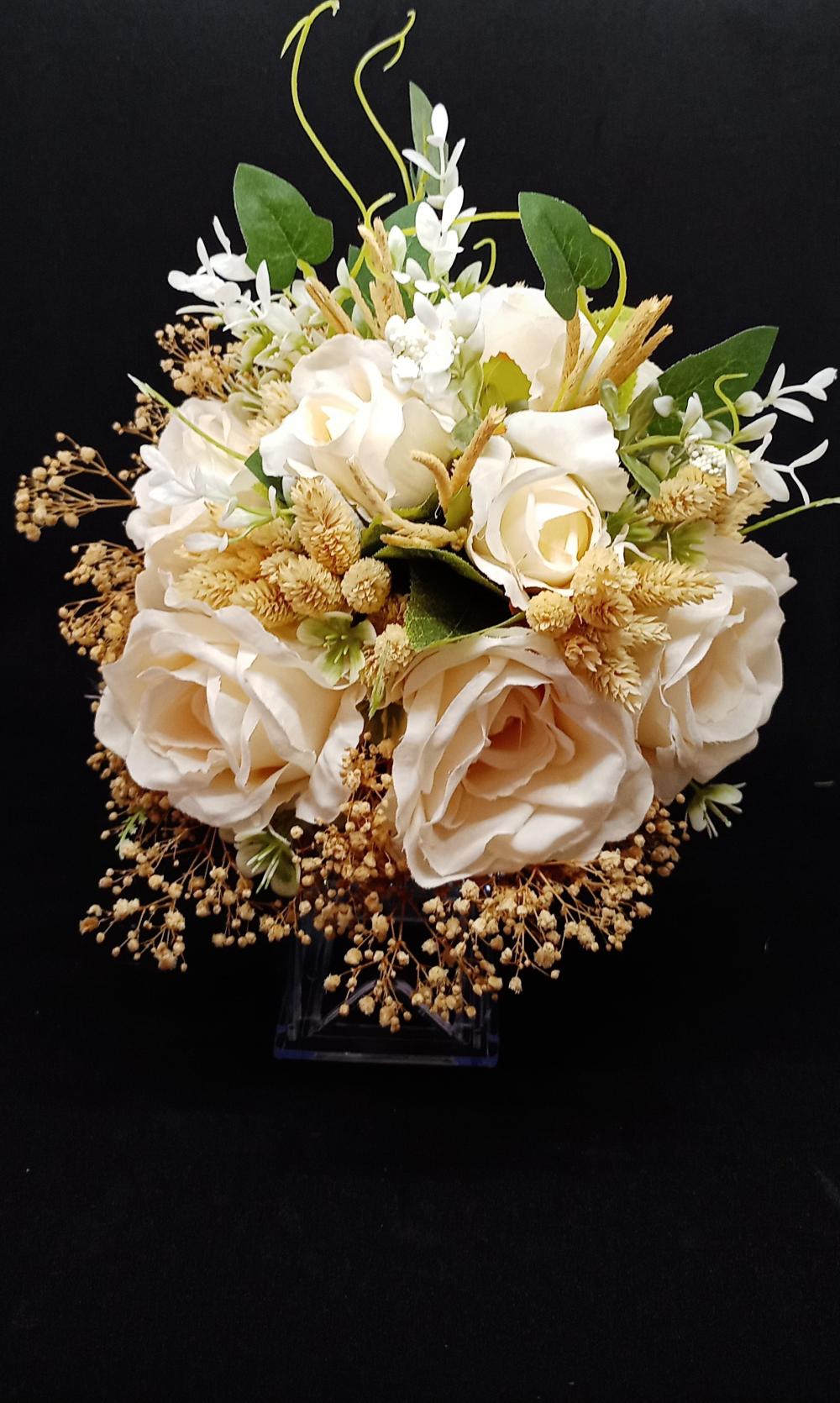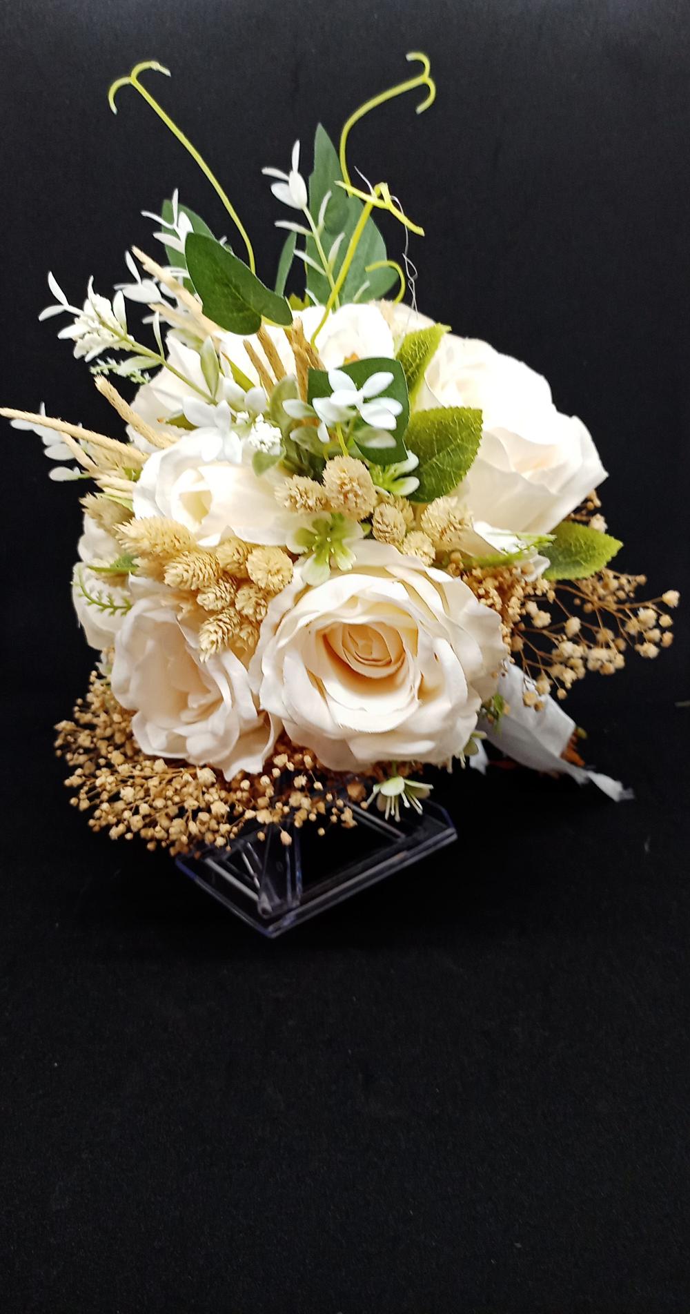 Yeşil Yapraklarla Süslenmiş Beyaz Gül Detaylı Gelin Buketi