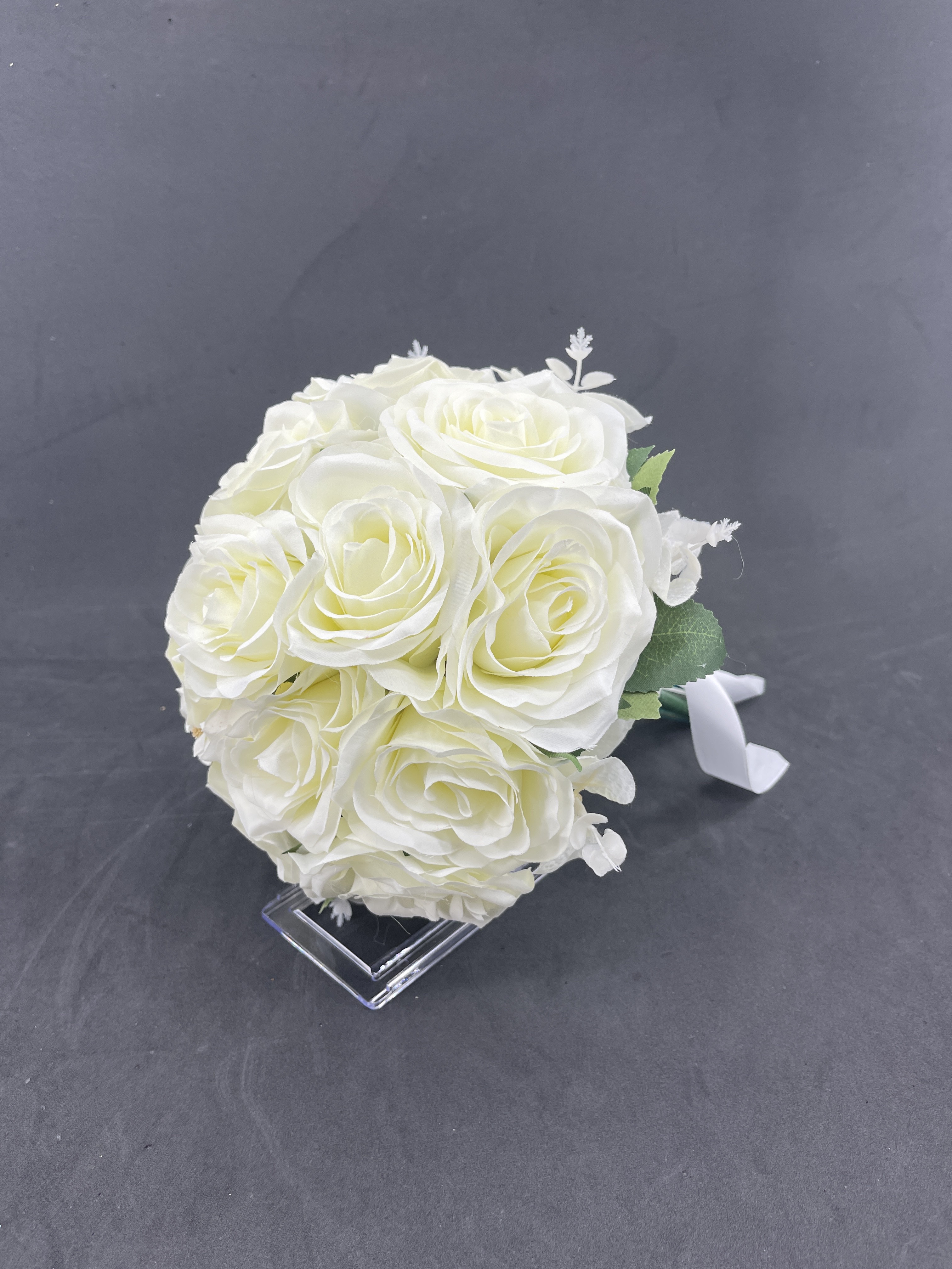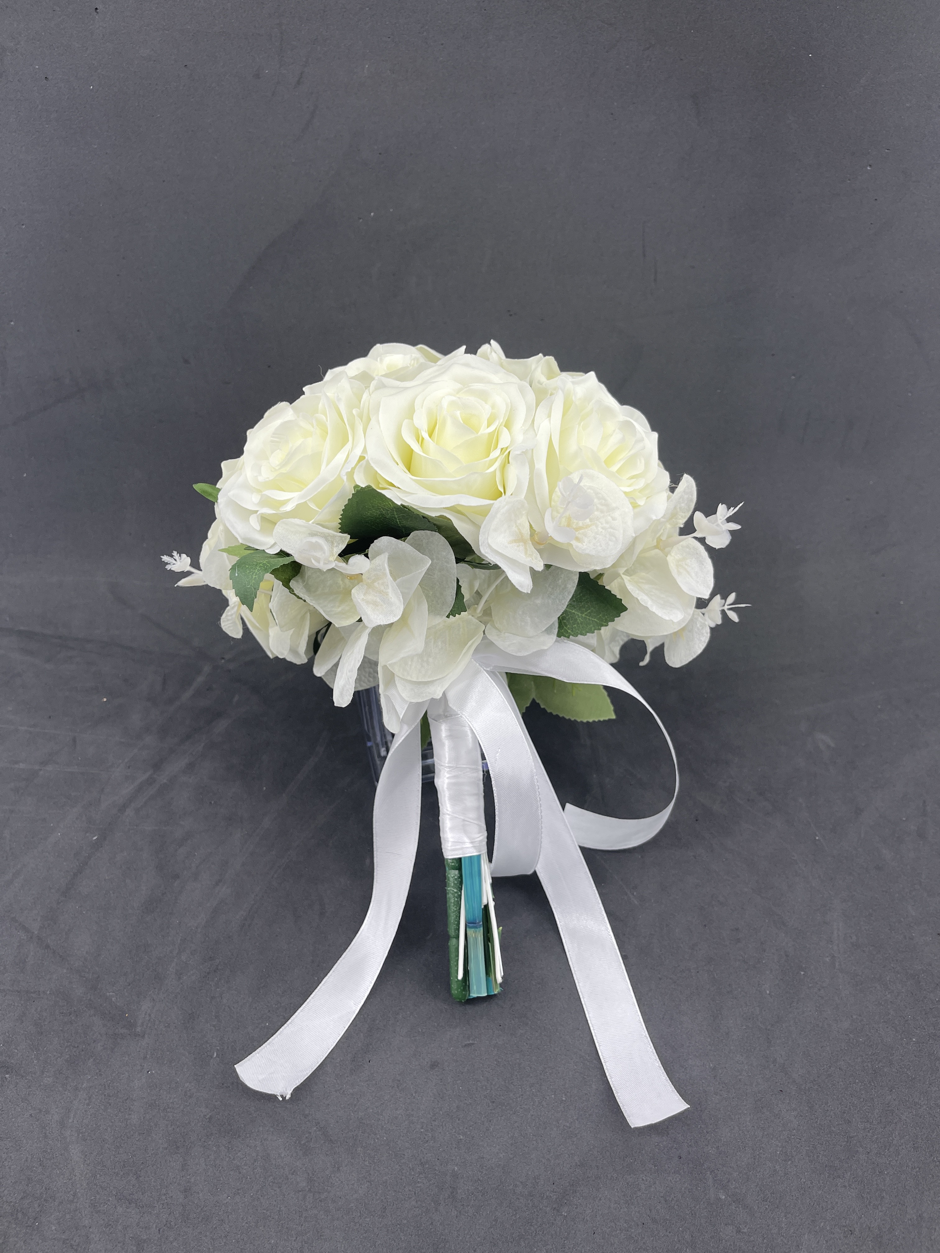 Beyaz Yeşil Yapraklarla Süslenmiş Kurdeleli Zarif Gül Gelin Buketi