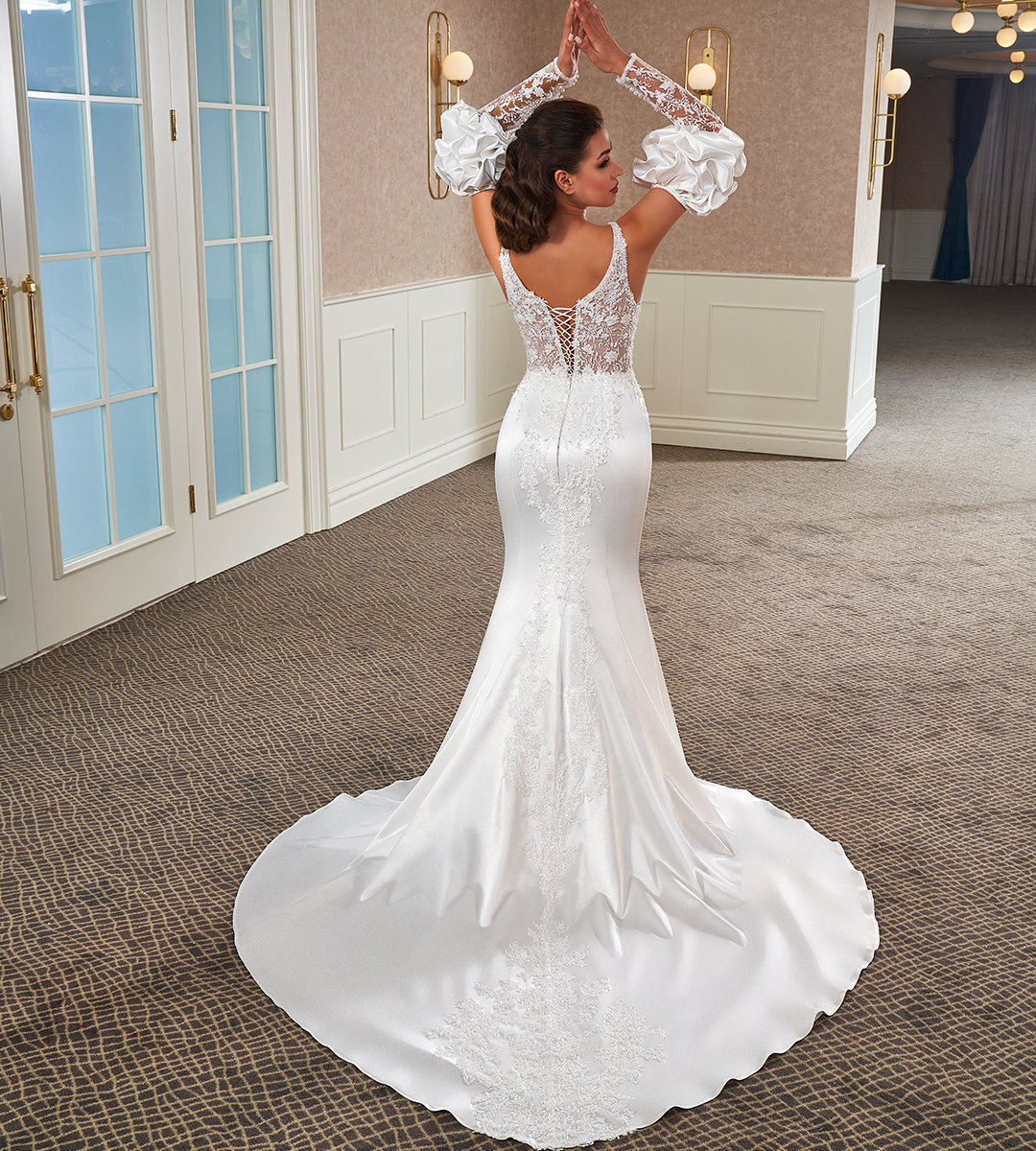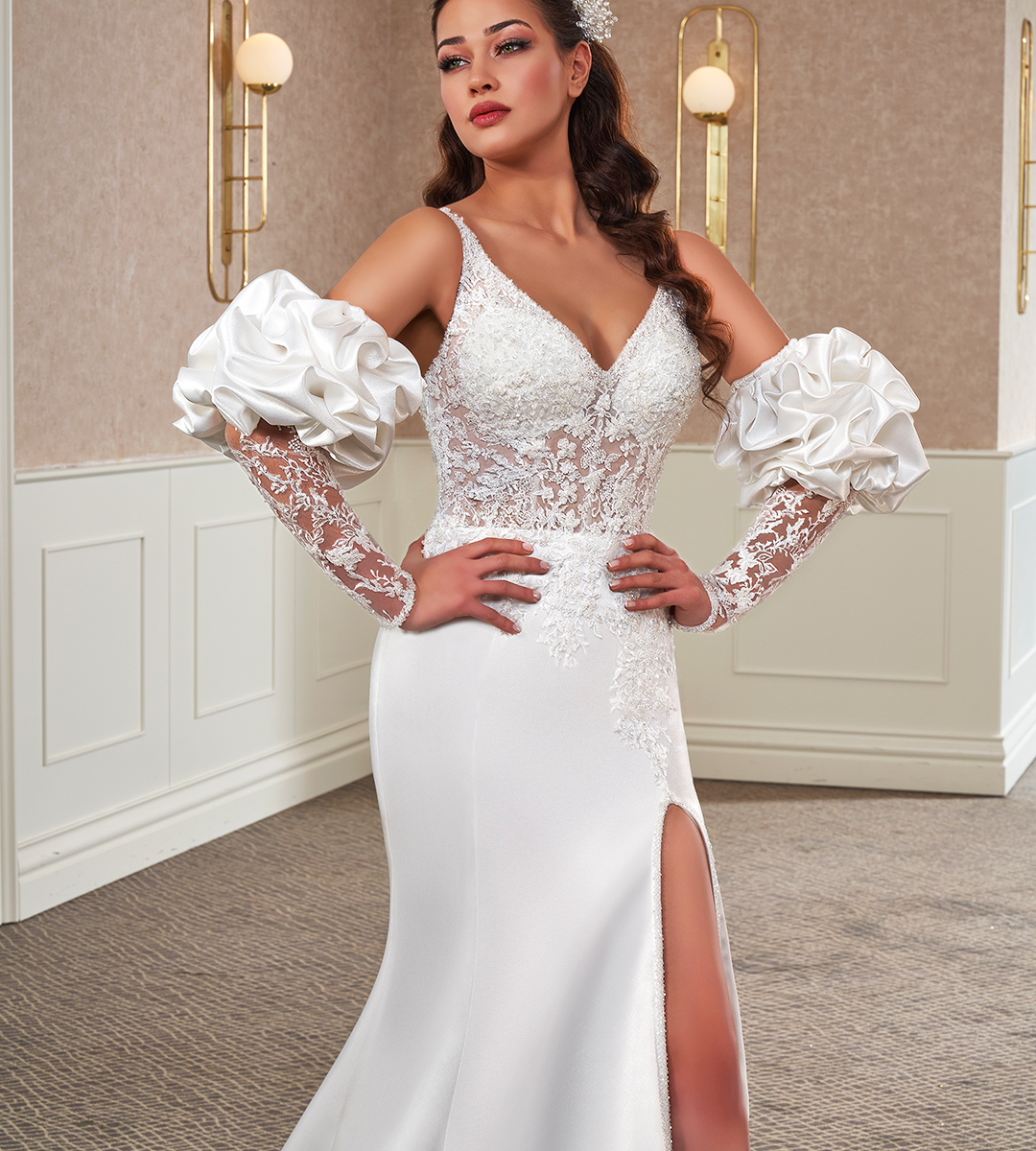Yırtmaçlı V Yaka İşlemeli Balık Gelinlik