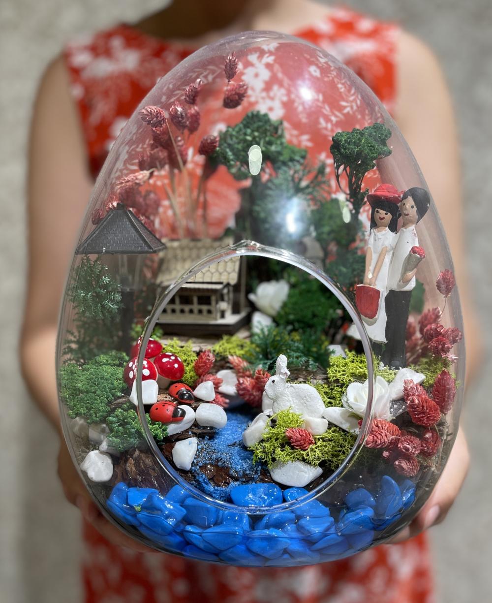 Sevgilinize ve sevdiklerinize özel günlerde armağan edebileceğiniz yumurta şeklinde mutlu çift, ev, ağaçlar, sokak lambası ve tavşan detayı olan cam fanuslu hediye